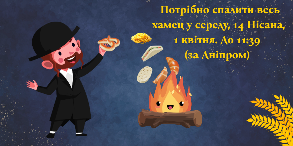 В середу 14 Нісана, 1 квітня. Кушати хамец можна тільки до 10:35, а його залишки потрібно спалити до 11:39. (за Дніпром) Зверніть увагу: під час спалювання хамецу цього року ми вимовляємо відречення від хамецу («все квасне і т.д.»), яке вказане в сидурі в порядку спалювання хамецу, також ми вимовляємо особливу молитву «Нехай буде воля Твоя», … Сжигание хамца