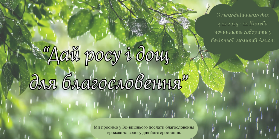 Сьогодні ввечері, починаючи з молитви «Маарів», у тексті молитви «Аміда» починається важлива зміна: додається вставка «Ве-тен таль у-матар». Ця фраза перекладається як «Даруй росу та дощ на добро» і вноситься в благословення про прожиток. Вона додається в благословення «Аміди», присвячене благословенню на прожиток, починаючи з 7 хешвану в Ізраїлі або з 4/5 грудня (за григоріанським календарем) в … Зимові зміни в молитві «Аміда»