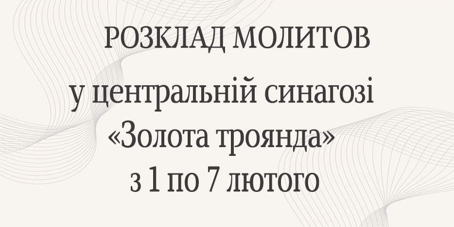 Центральна синагога «Золота троянда» інформує про час початку молитов на період з 1 по 7 лютого, які відбуватимуться у головному молитовному залі. Адреса синагоги: вулиця Шолом-Алейхема, 4. НеділяШахарит – 07:00Шахарит – 09:00Шахарит – 10:00Мінха – 13:30Мінха – 16:25Маарів – 17:15 Понеділок – ЧетверШахарит – 07:00Шахарит – 08:30Шахарит – 10:00Мінха – 13:30Мінха – 16:30Маарів – 17:15Маарів … Розклад молитов на період з 1 по 7 лютого