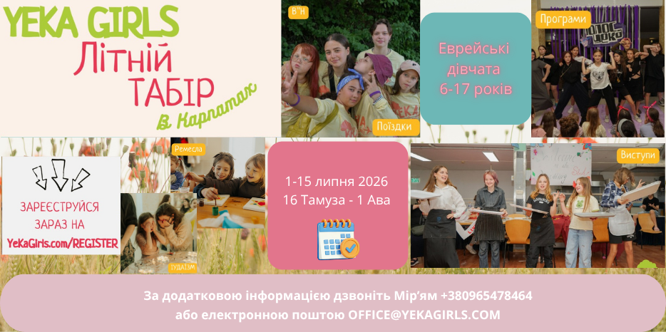 Registration is now open for the “YEKA Girls” Summer Camp in the Carpathians for Ukrainian Jewish girls on the maternal line aged 6-17. The camp will be held from July 1 to 15 (16 Tamuz – 1 Ava) at a comfortable base in the Ivano-Frankivsk region. Registration is required here Registration ends on June 1! … The “YEKA Girls” Summer Camp in the Carpathians will be held from July 1 to 15. Registration ends on June 1!