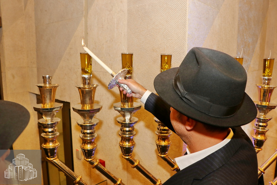 At the second Hanukkah in the center’s Gallery, the Lubavitcher Rebbe’s envoy, Rabbi Moishe Listengurt, lit festive candles with appropriate blessings.