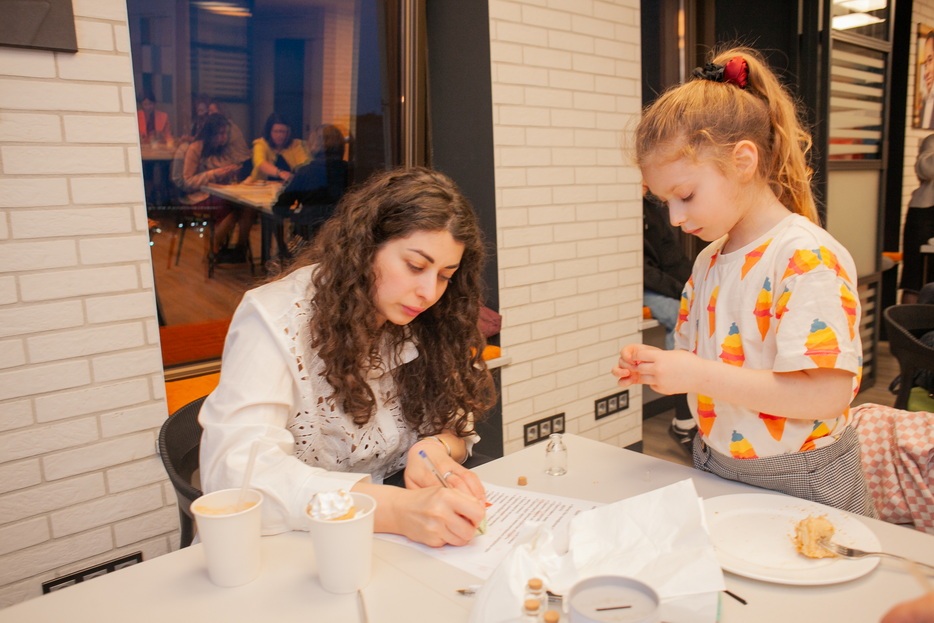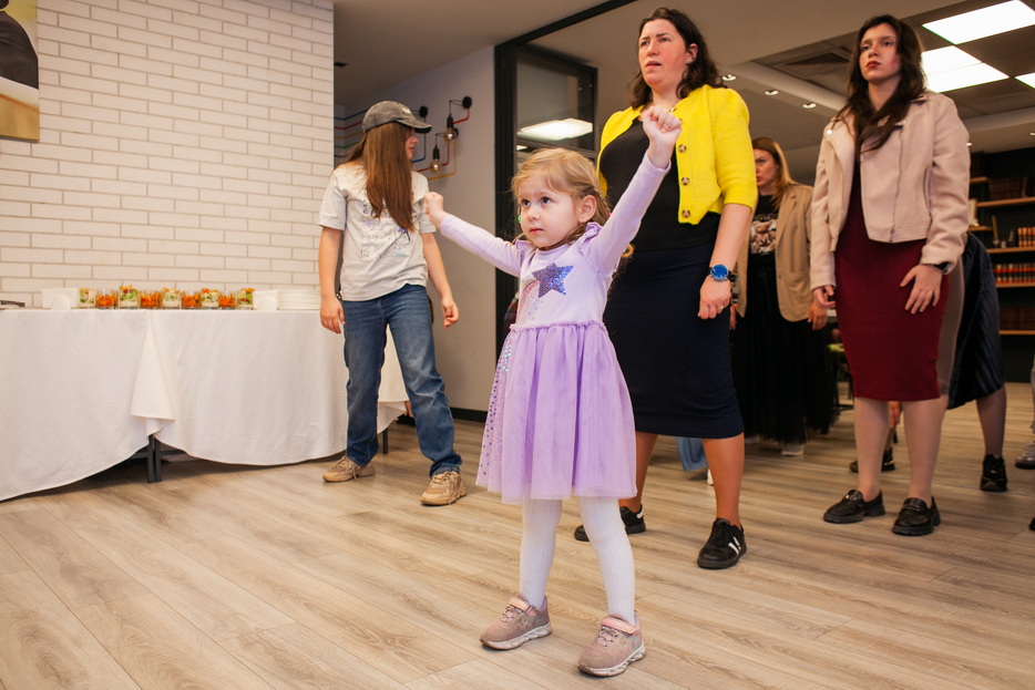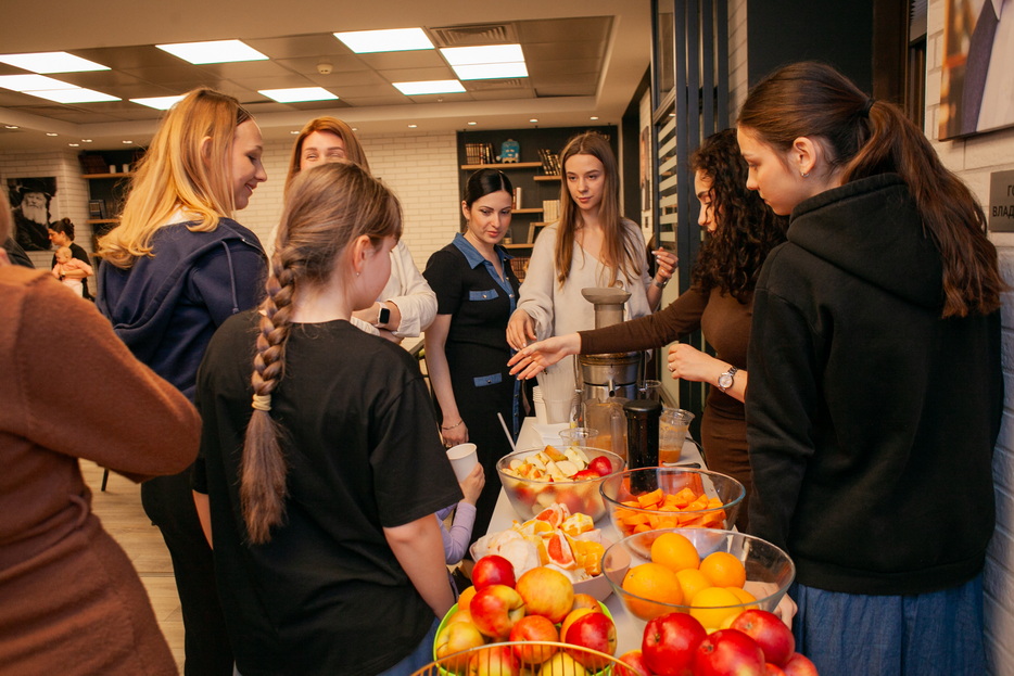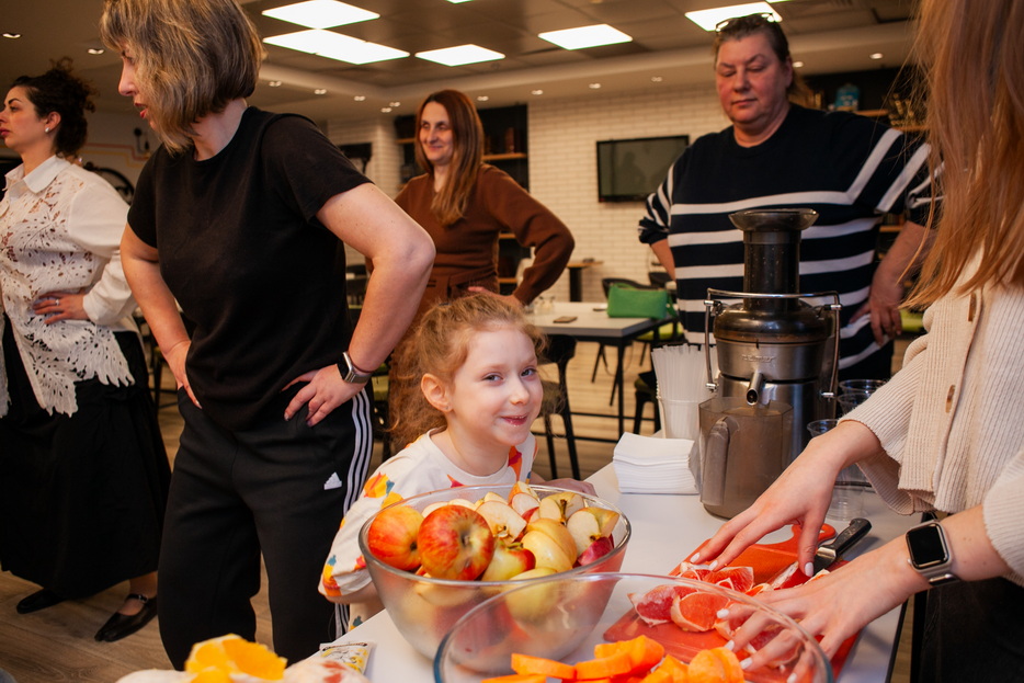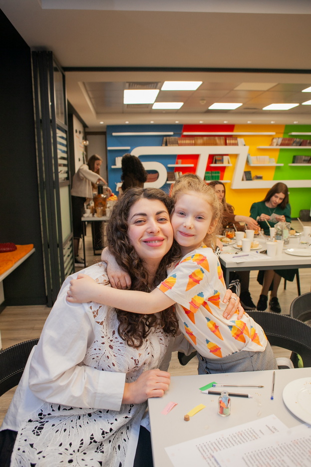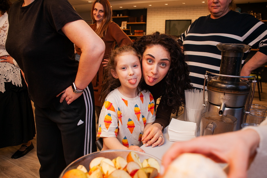 At the beginning of the gathering, the participants were greeted by a Fresh bar, where mothers and daughters could make their own freshly squeezed juices from oranges, apples, carrots, and grapefruits, creating healthy vitamin drinks for themselves. This was followed by a sports workshop led by coach and trainer Beila Gaft. The participants, both adults and children, performed simple exercises suitable for daily life, aimed at improving posture, well-being, and relieving tension. After the active portion, a light healthy buffet was organized.