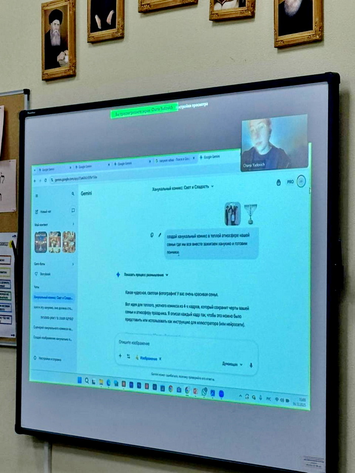 This interactive lesson, held via videoconference on one of the days of Hanukkah, was led by Machon student Chana Yudovich. She explained how artificial intelligence can be used to create comics and even video clips about the history and traditions of the holiday, and how to effectively utilize the capabilities of artificial intelligence to spread the values of Yiddishkeit and Hasidism.