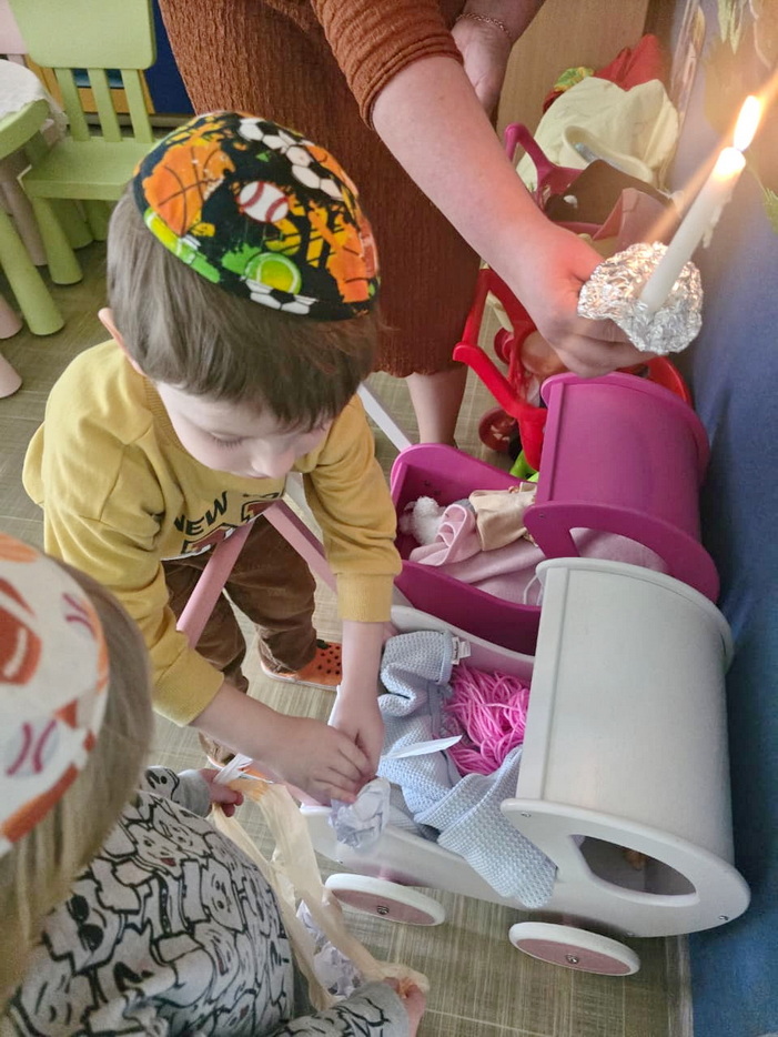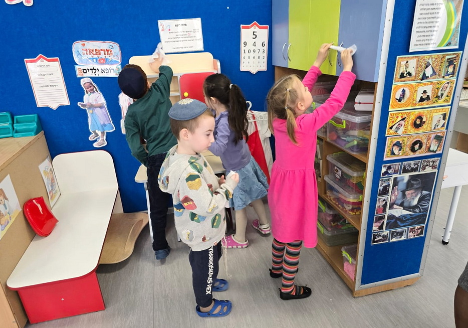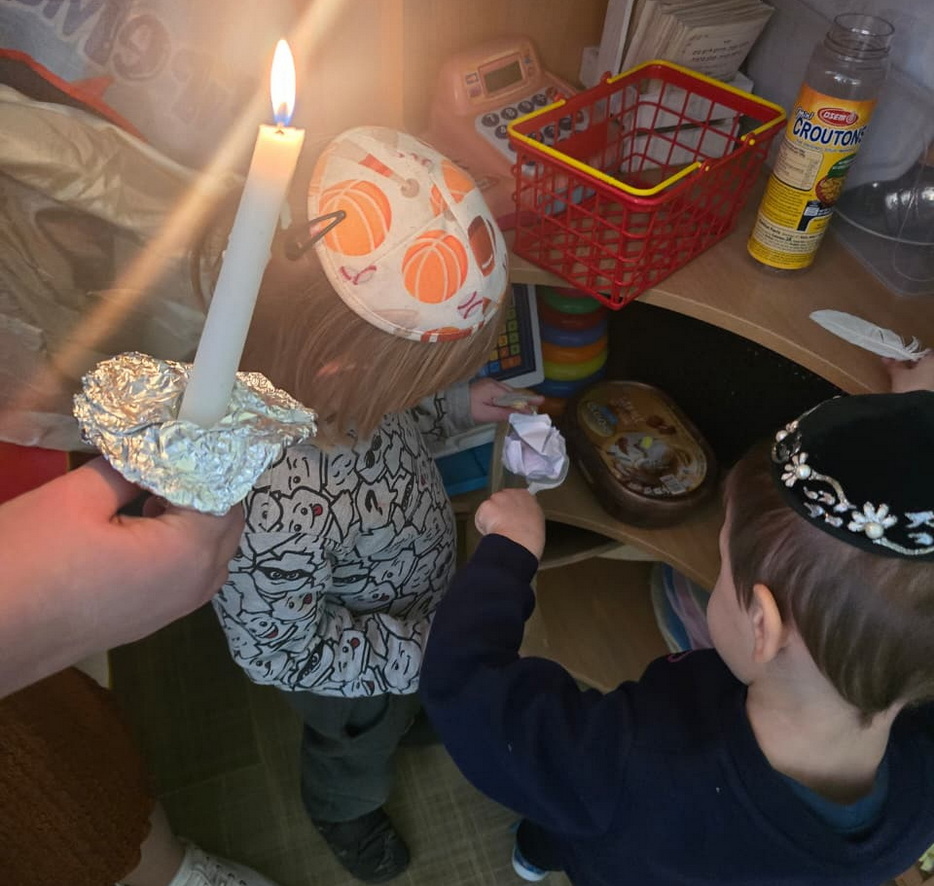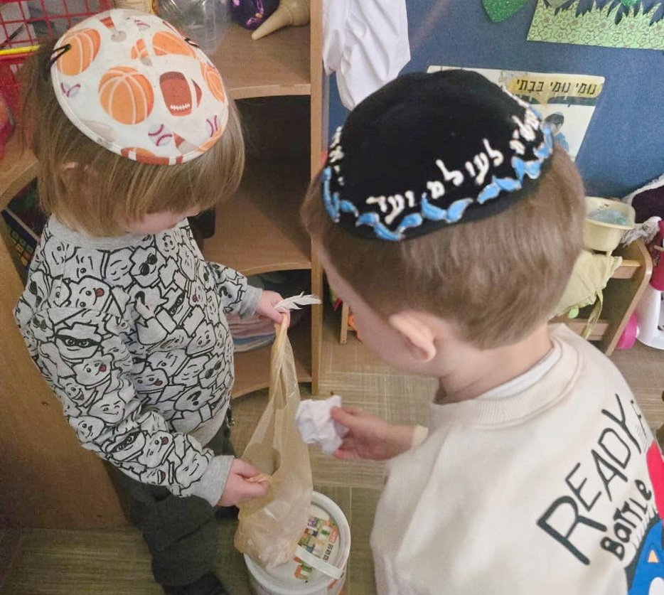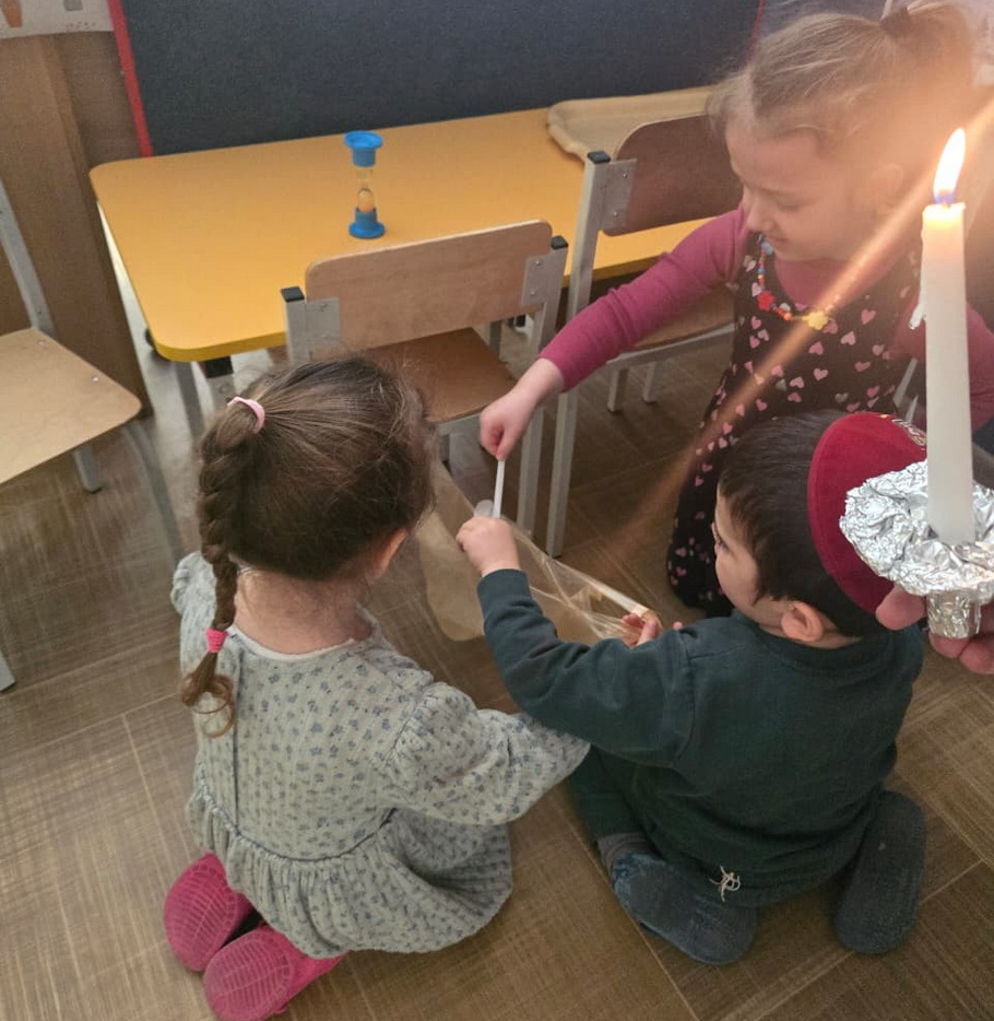 After the cleaning was completed, a symbolic “bedikas chametz” was conducted in each group – the children used a candle to search for leftover crumbs, carefully gathered them into bags, and then performed a symbolic burning of the chametz, recreating the procedure that will be observed at home on the eve of Pesach. Throughout the process, they were given detailed explanations of how this mitzvah is performed and why it holds such significance.
