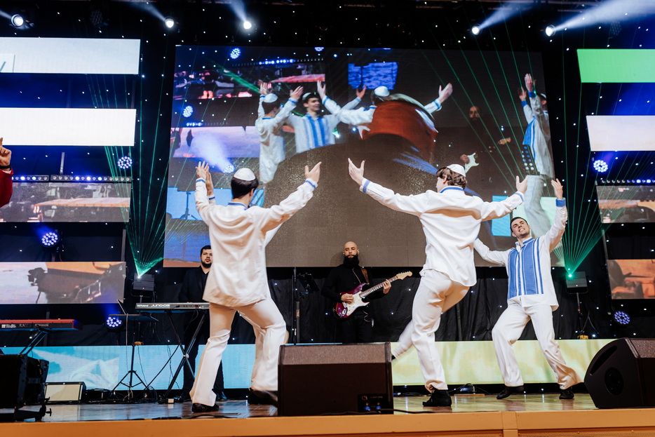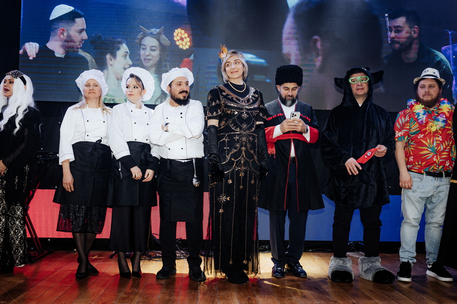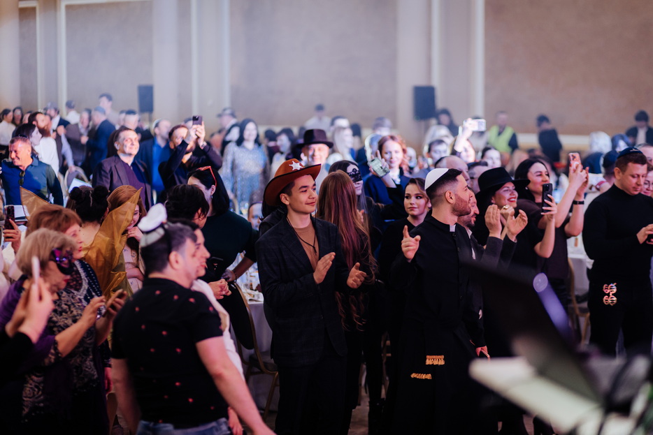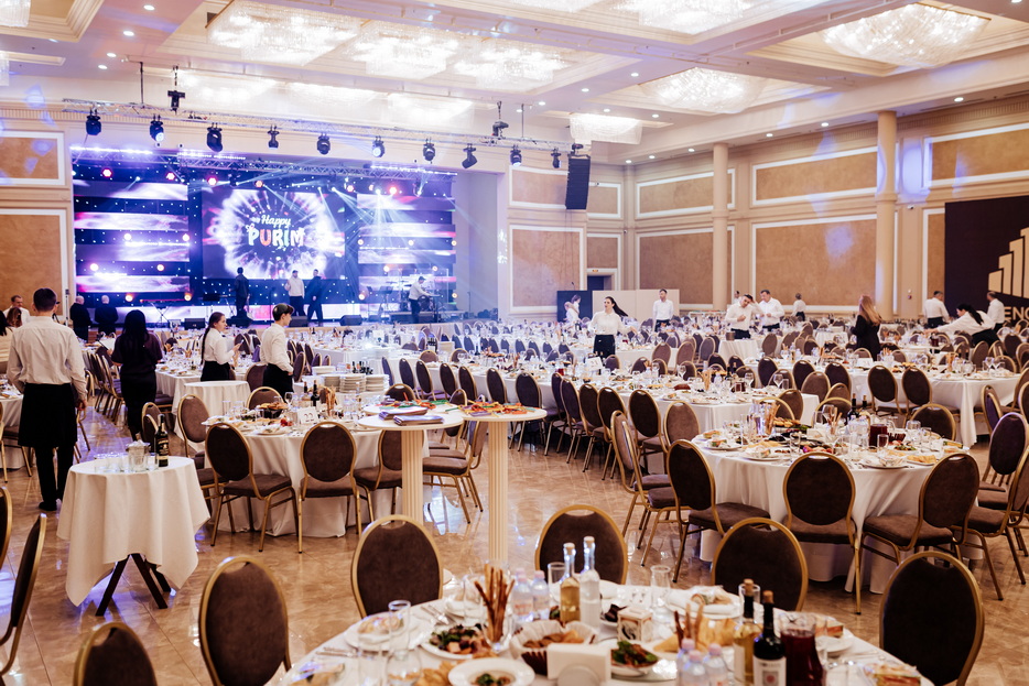 Following a welcome party with photo opportunities, guests proceeded to the main hall, where the evening’s central events began with a video of the Rebbe and the fulfillment of the primary Purim mitzvah – hearing the reading of the Megillah. For the convenience of the guests, four simultaneous Megillah readings took place in the Menorah Grand Hall, led by Rabbi Menachem Mendel Feldman, Rabbi Moshe Neumann, Reb David Maltsev, and Rabbi Levi Karelenstein. All participants listened attentively to every word of the Megillah, fulfilling the holiday mitzvah and actively drowning out the name of the primary villain, creating a uniquely vibrant atmosphere.