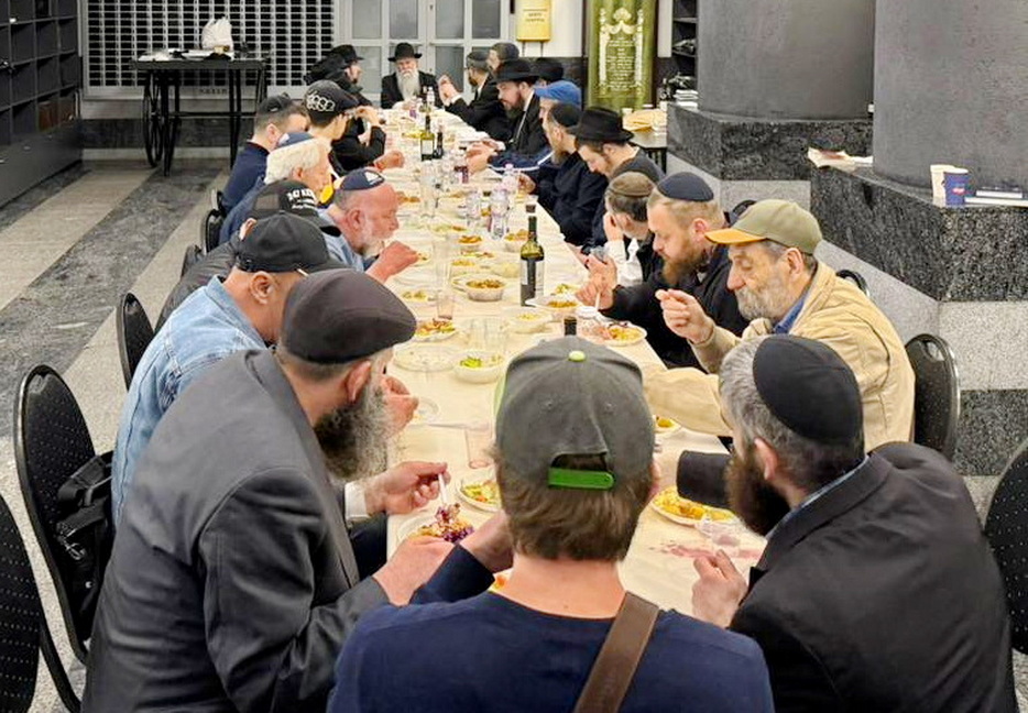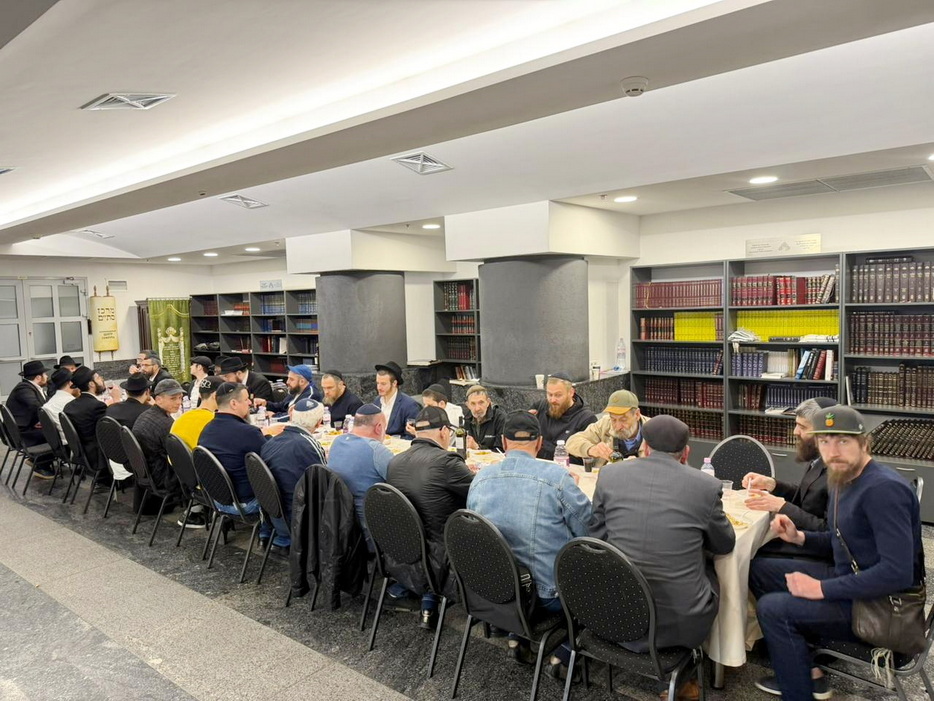The main event was a large men’s farbrengen held at Dnipro’s central “Golden Rose” Synagogue, attended by numerous community members, regular congregants of the synagogue, shluchim – the Rebbe’s emissaries – as well as guests who had come to Dnipro to spend Pesach and joined in marking this special day with Chassidic joy.