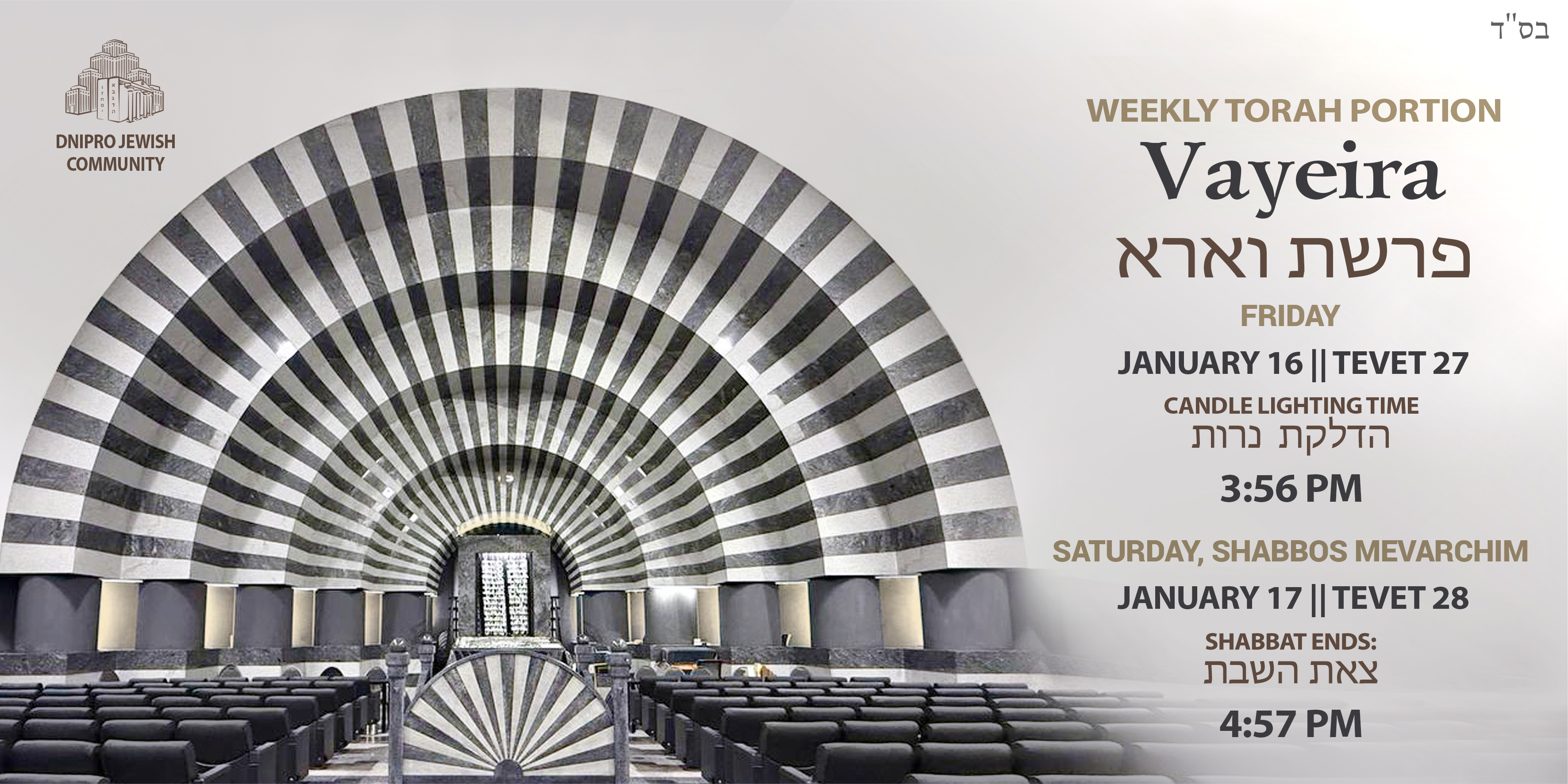 Blog / News / Shabbat Candle Lighting Time Shabbat Candle Lighting Time Manager1 | 24 Tevet 5786 (13.01.2026) 0 On Friday, January 16th, in Dnipro, candle lighting time for Shabbos is at 3:56 PM. Shabbos ends on Saturday, January 17th, at 4:57 PM. The weekly Torah portion is “Vayeira”, Shabbos Mevarchim.