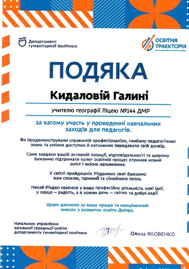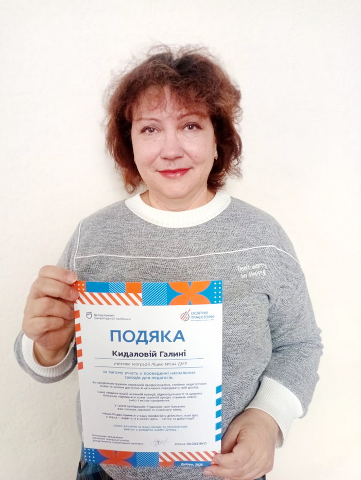 Учительку географії Галину Кидалову було відзначено Почесною подякою Департаменту гуманітарної політики Дніпровської міської ради за вагомий внесок у розвиток сучасної освіти та активну участь у проведенні навчальних заходів для педагогів міста.