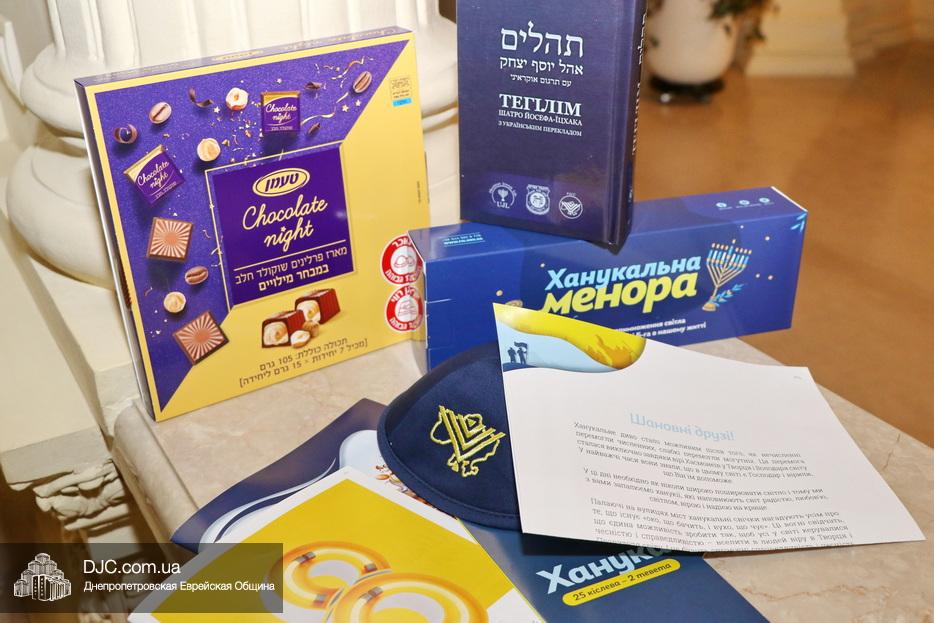 Каждый получил набор, включающий ханукию с комплектом свечей на все дни праздника, сладкий подарок, уникальное издание Тегилим на украинском языке и поздравительное письмо, подписанное Главой совета Федерации раввином Меиром Стамблером и Главным раввином Днепропетровского региона Шмуэлем Каминецким.