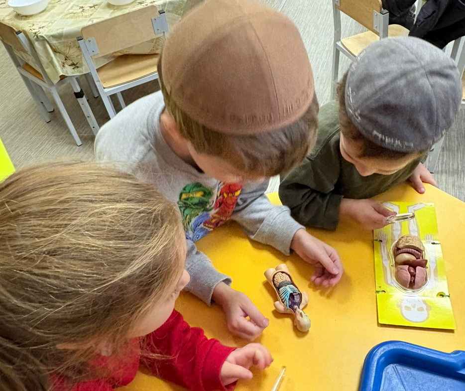 Темой этой недели в «Бейт Циндлихт» было знакомство с телом человека, его частями, внутренними органами, основными функциями и важности заботы о здоровье, как физическом, так и духовном. Занятия проходили в игровой форме с использованием кукол, рисунков, аппликаций, развивая творчество и стимулируя исследовательский интерес.