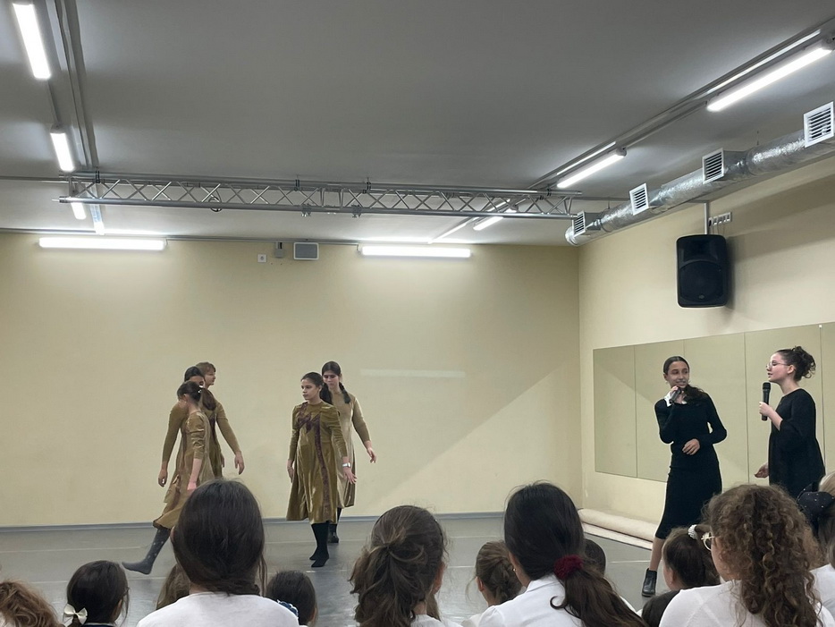 Поэтому часть программы проходила в классе вместе с классными руководителями, а часть программы, именно подготовка к 19 Кислева, состоялась в спортзале, где ученицы 9 класса подготовили сценку про то, что в нашем мире все происходит не случайно, а так, как было задумано Вс-вышним, только нужно понять и постараться увидеть эту связь. Затем воспитанницы 7 класса представили вниманию красивый танец.