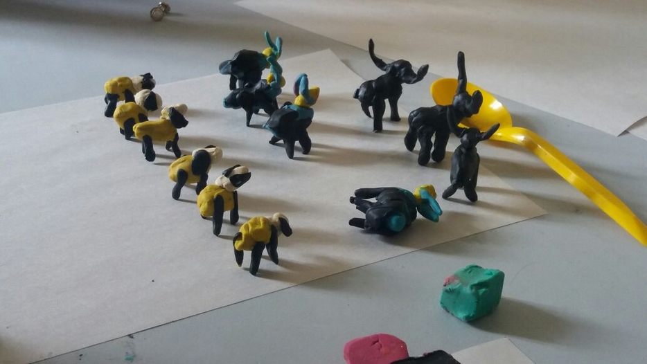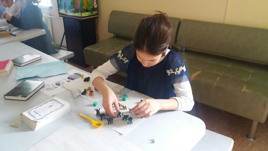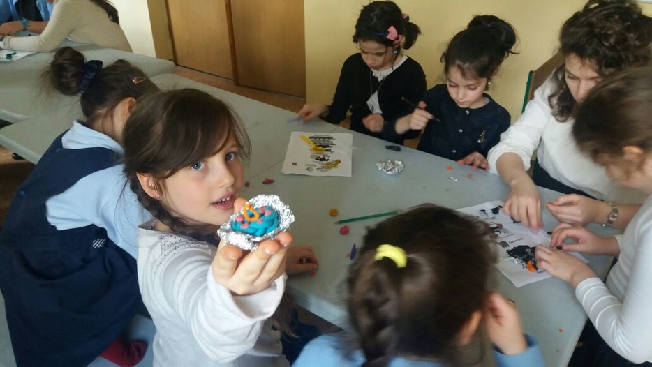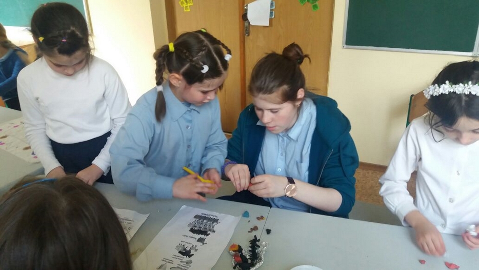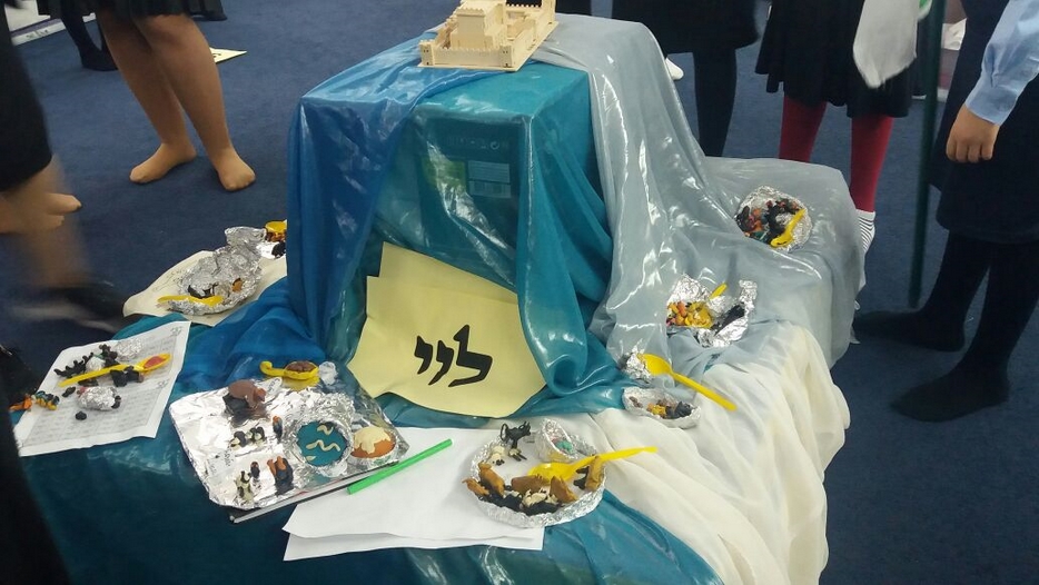 Потом все классы собрались вместе, чтобы разделится на 12 команд, в соответствии с 12 коленами Израиля, причем в одной команде были девочки из совершенно разных классов. Каждая команда, выполняя различные задания, должна была собрать материалы (пластилин и фольгу), из которых впоследствии нужно было сделать подарки, которые приносили главы 12 колен при освящении Мишкана. Из пластилина изготовляли животных, а из фольги – серебряные блюда.