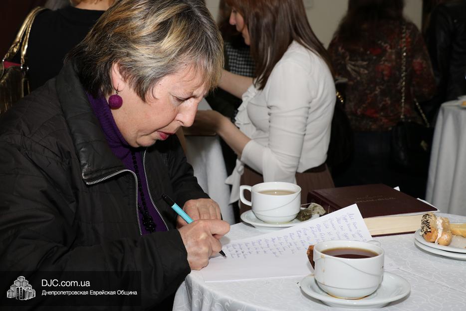 Даниэла Листенгурт рассказала о новой традиции, появившейся у хасидов ХаБаДа – изучать послания Ребе, написанные в тот день в прошлом, когда еврейская и гражданская дата, так же совпадали, как и в настоящий момент. Исходя из этого, еврейские женщины Днепра изучали послание Ребе, написанное в 5743 году.