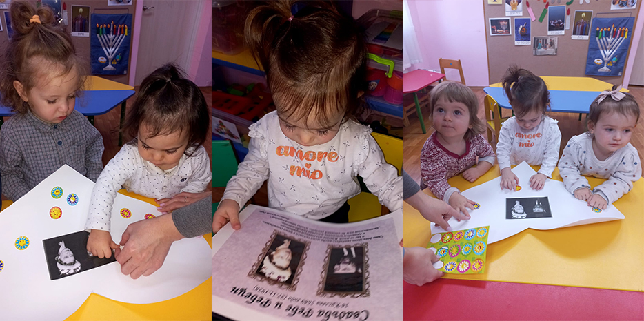 В игровой форме воспитатели рассказывали нашим маленьким воспитанникам что такое «Хупа» и как она проходит. Также на творческих занятиях детки украшали наклейками заготовку с фотографиями Ребе и ребецн, а затем в их честь угощались печеньем.