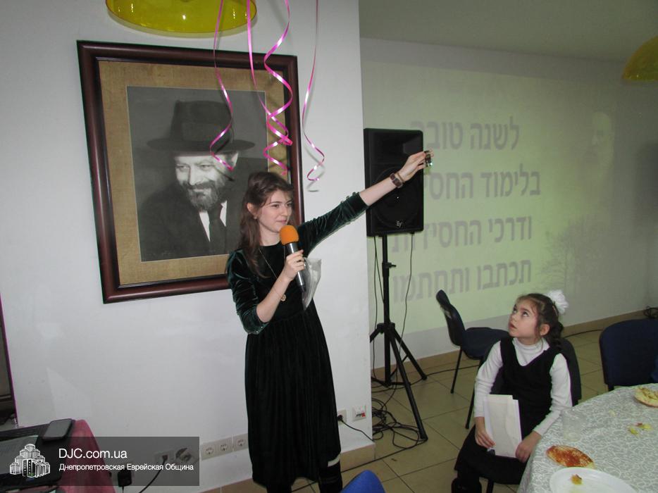 После трапезы перед ученицами махона выступила ребецн Дина Стамблер из города Каменское, которая рассказала о сути дня 19 Кислева для хасидов Хабада и несколько историй из жизни Алтер Ребе. Затем началась кульминация праздника, к которой девочки махона готовились еще задолго до дня 19 Кислева.