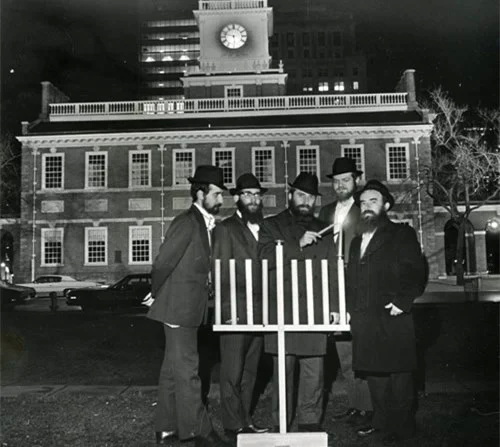 Представитель Хабада раввин Авраам Шемтов (справа) и другие раввины зажигают первую публичную менору перед знаменитым филадельфийским Колоколом Свободы.