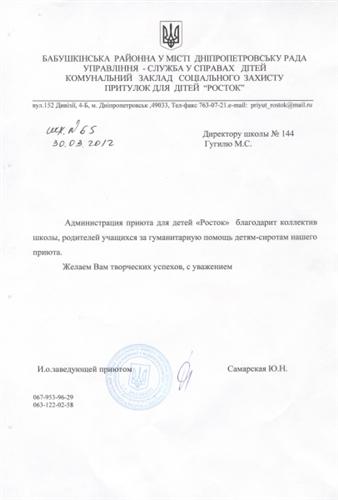 После того, как вещи были отвезены в приют «Росток», на имя директора школы Михаила Гугеля пришло письмо-благодарность, в котором говорится: «Администрация приюта для детей «Росток» благодарит коллектив школы, родителей учащихся за гуманитарную помощь детям-сиротам нашего приюта».
