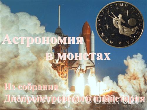 Затем Александр Прокофьев начал свою презентацию, посвященную проявлениям астрономии, в широком смысле этого слова, в нумизматике. На большом экране он продемонстрировал коллекцию монет днепропетровского Планетария, на которых изображены природные космические объекты, спутники и корабли, астронавты и многое другое, имеющее отношение к пространству за пределами земной атмосферы.