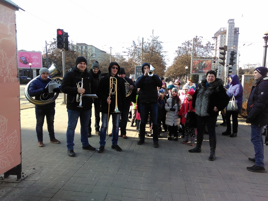 А затем наступило время для кульминации праздника – под звуки духового оркестра участники программы прошли торжественным маршем по улицам горда, распространяя весть о приближении Пурима. Многие были в карнавальных костюмах, изображая различных эукариотов – коровок, овечек, медведиков, полицейских и другое.