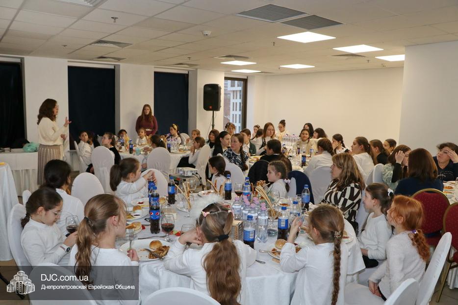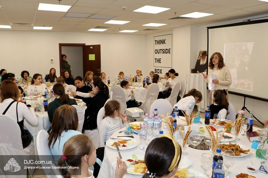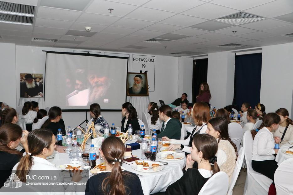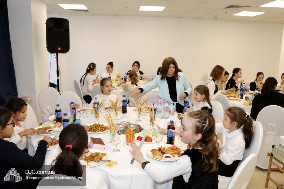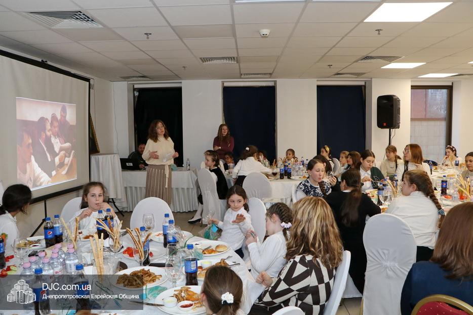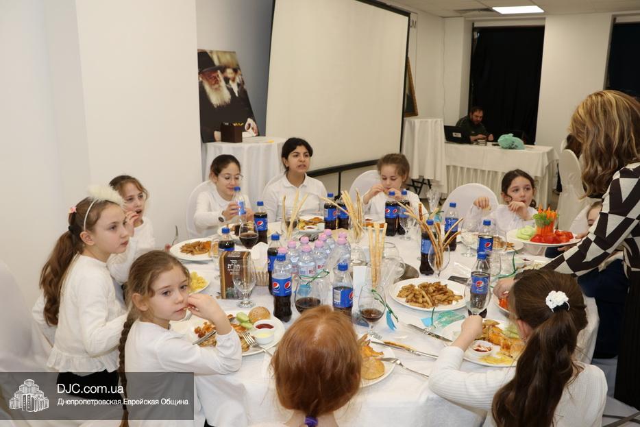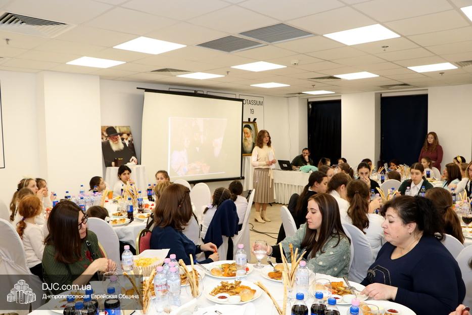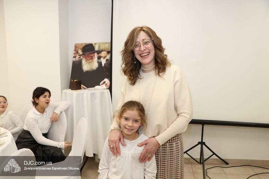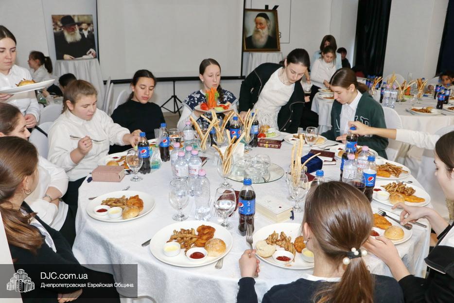 Затем состоялся настоящий хасидский фарбренген с вкусной и кошерной едой, а специальным гостем праздника стала ребецн Хана Каминецкая, рассказавшая девочкам историю о том, как они с ее супругом, Главным раввином Днепра реб Шмуэлем Каминецким, начинали свой посланнический путь в нашем городе в далеком 1990 году.