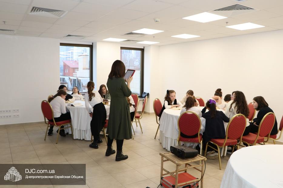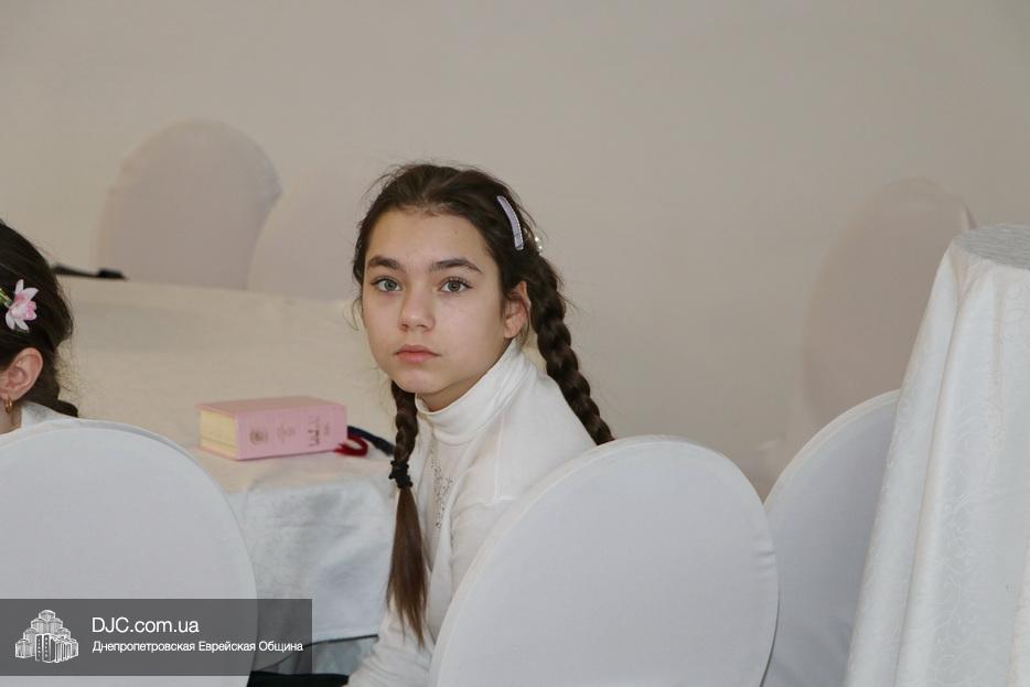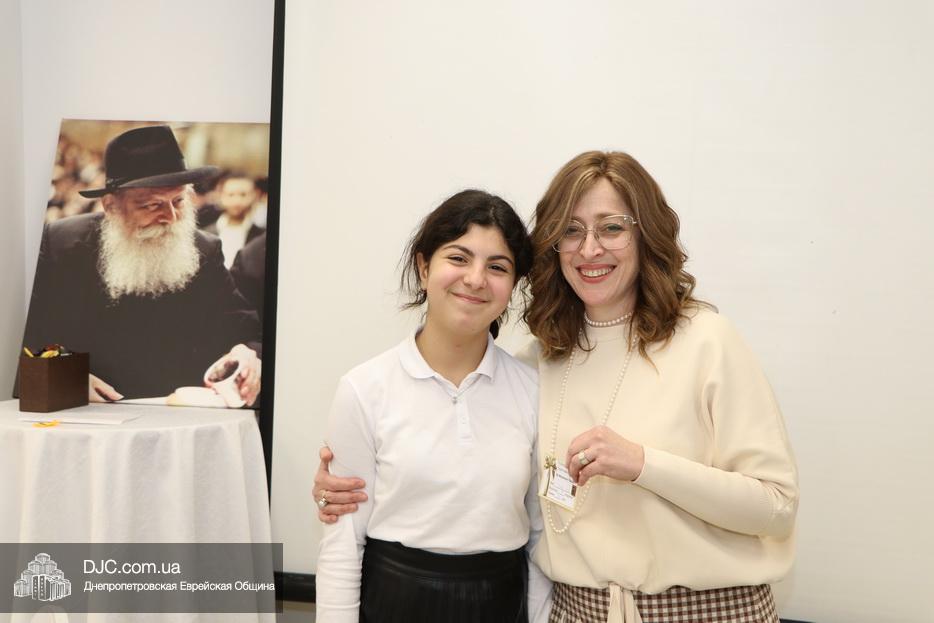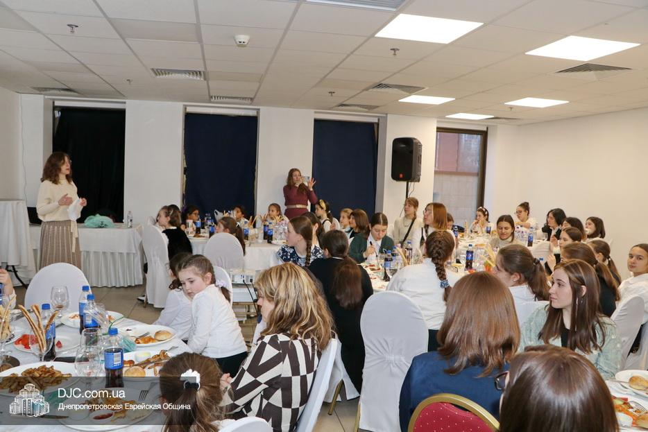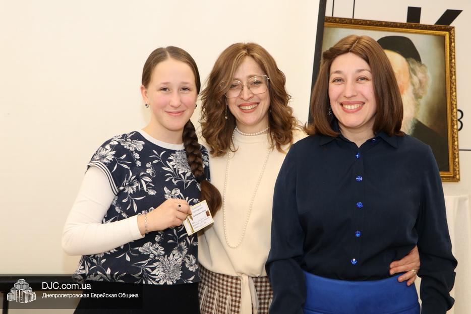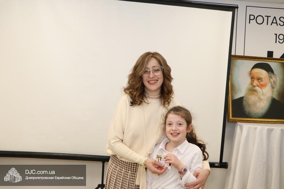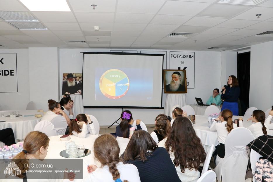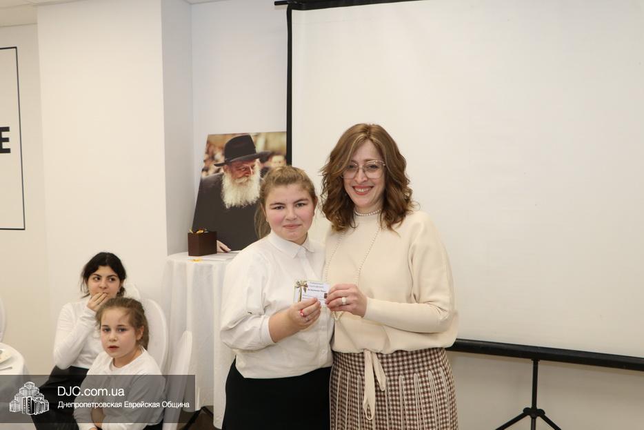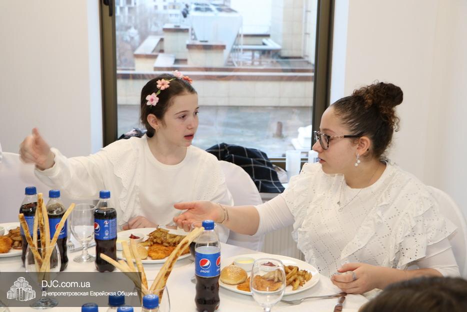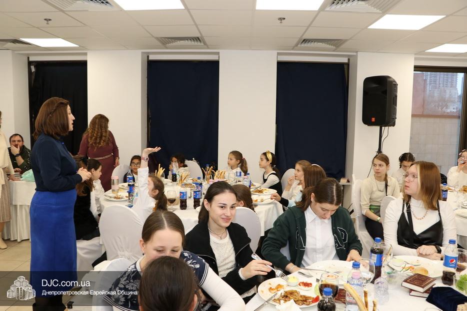 Затем состоялся настоящий хасидский фарбренген с вкусной и кошерной едой, а специальным гостем праздника стала ребецн Хана Каминецкая, рассказавшая девочкам историю о том, как они с ее супругом, Главным раввином Днепра реб Шмуэлем Каминецким, начинали свой посланнический путь в нашем городе в далеком 1990 году.