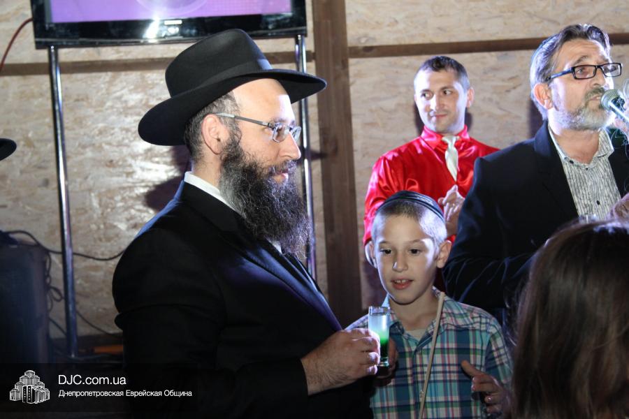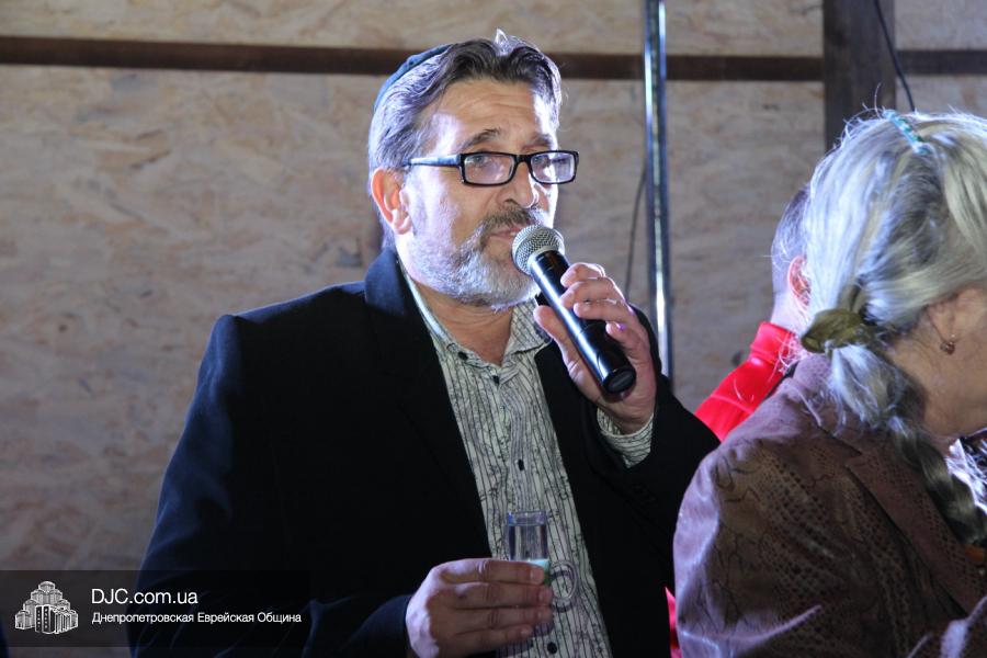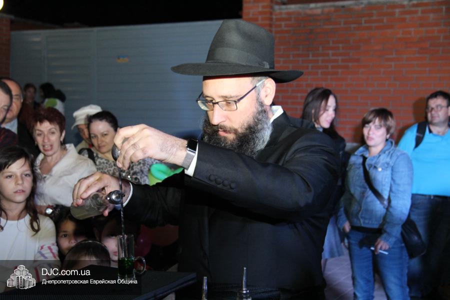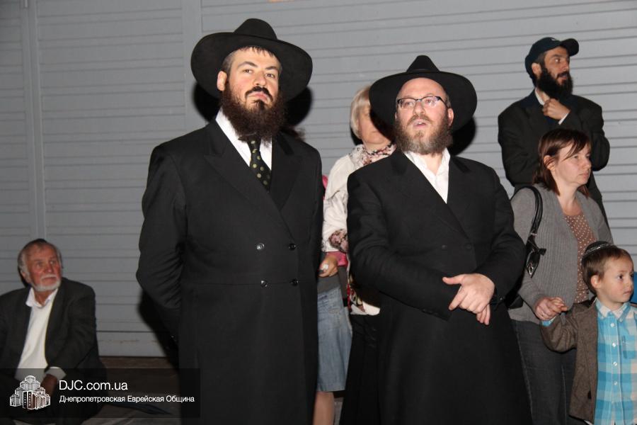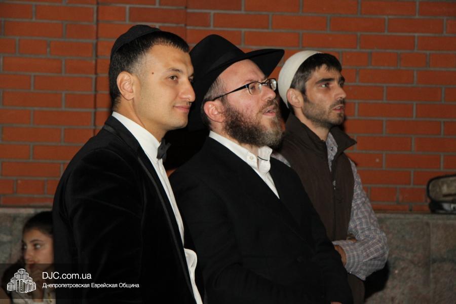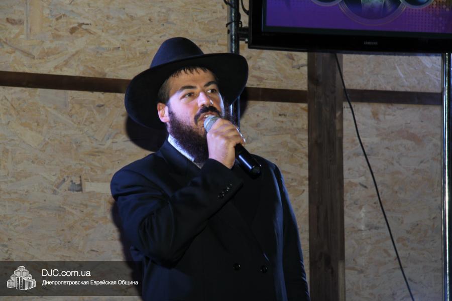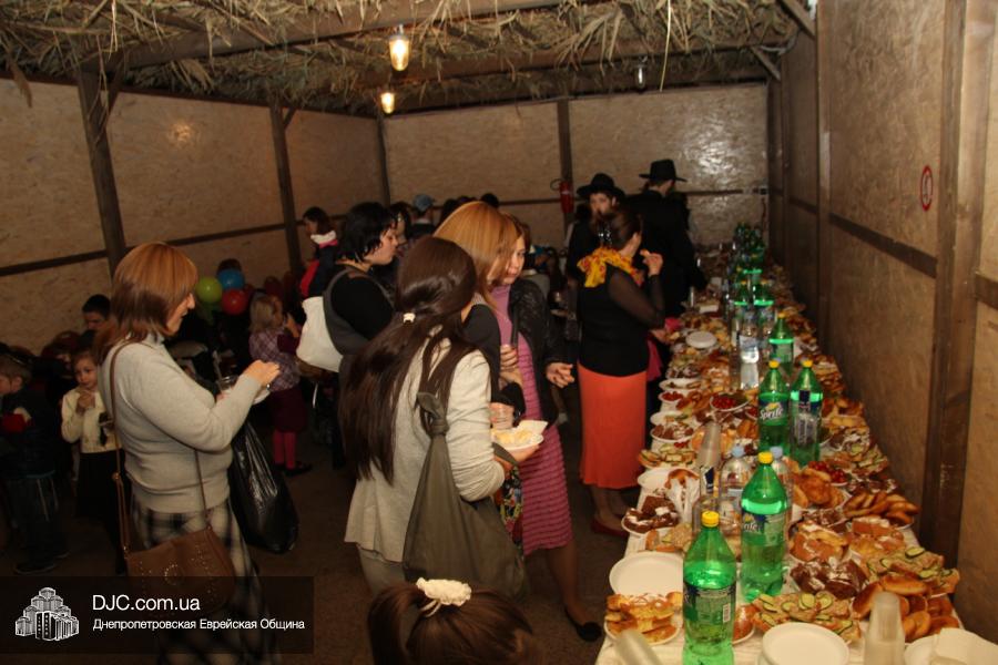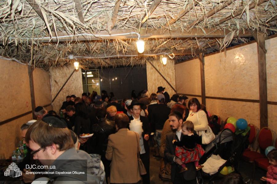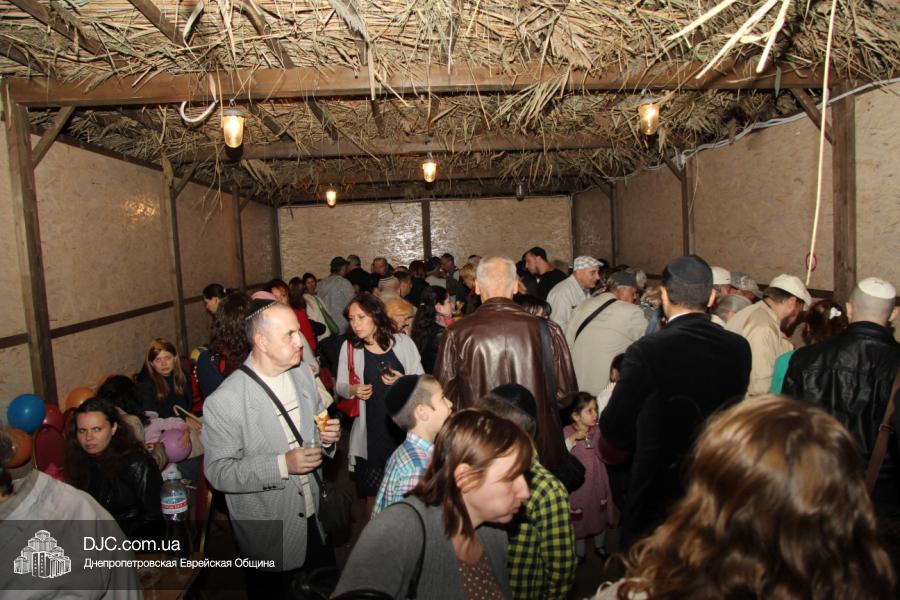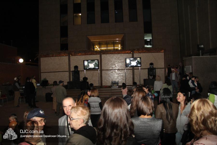 Вначале, конечно же, было исполнение заповедей и вкушение яств в самой сукке, ибо во все дни праздника евреи должны есть и пить именно находясь в шалаше. После того как все с большим удовольствием исполнили это предписание, на больших экранах, установленных на наружной стене сукки, был показан фрагмент видеообращения Седьмого Любавического Ребе Менахема-Мендела Шнеерсона, а затем со словами приветствия и поздравления с праздником к собравшимся обратился Главный моэль Украины и Молдовы раввин Яков Гайсинович.