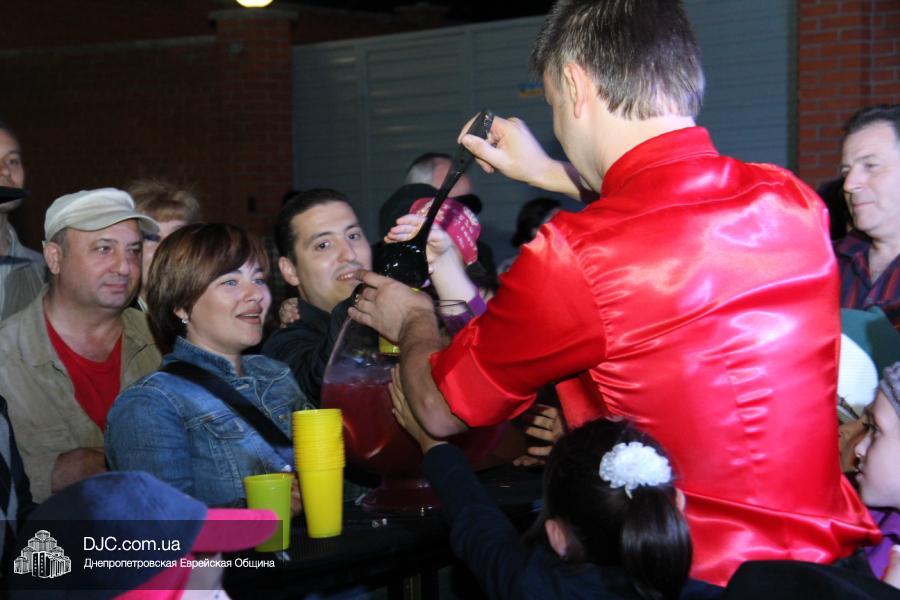 В это время для взрослых выступил инструментальный дуэт «Студия La tre» – скрипка и аккордеон, под которые с удовольствием танцевали не только дети, но и взрослые. После того как все получили достаточный заряд позитивной энергии и развеселились, наступил черед бармен шоу, состоящего из двух частей – вначале конкурса было приготовление «слоистого коктейля», в котором смогли принять участие трое желающих из публики (после подведения итогов участники отправились дегустировать получившееся в сукку), а затем два профессиональных бармена продемонстрировали, как можно приготовить пунш путем жонглирования разными бутылками, в том числе, и с зажженными внутри них римскими свечами. Приятным бонусом к яркому зрелищу была возможность отведать результат – приготовленный таким способом пунш (для детей – коктейль из разных видов сока).
