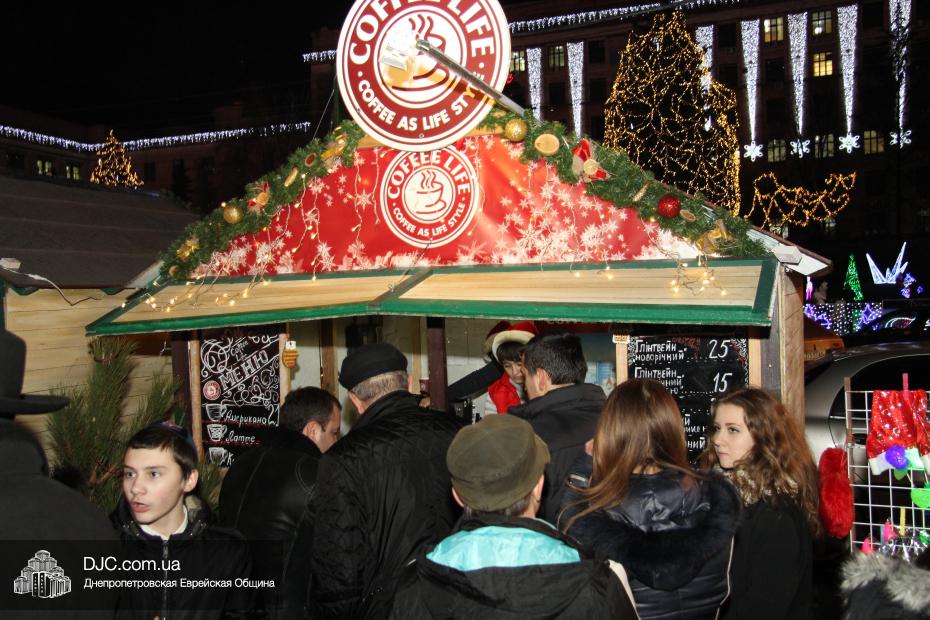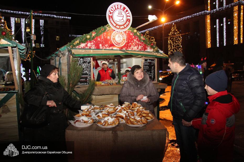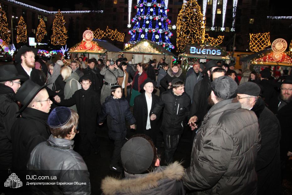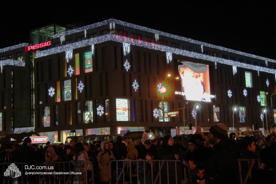 К зимним праздникам площадь украсилась иллюминацией, на ней был установлен городской каток, большая сцена для концертов и французская карусель, появившаяся несколько лет назад между «Пассажем» и ЦУМом, вдруг органично вписалась в обновленный облик площади, потерявшей сразу весь свой грозный дух сталинского ампира и ставшей радостной, уютной, соразмерной человеку, европейской. Именно на этой площади, впервые в истории города, и произошло чудо. На сцене была установлена Ханукия, в торговых палатках появились кошерные лакомства, а на гигантском экране «Пассажа» (играющего в Днепропетровске роль вечевого колокола древних городов) появились видеоролики, показывающие зажжение ханукальных свечей, сюжеты о том, как проходил восьмой вечер Хануки в синагоге «Севен Севенти», которые сменялись портретами Любавического Ребе и заставкой с Ханукией и надписью «Хаг Ханука Самеах!».