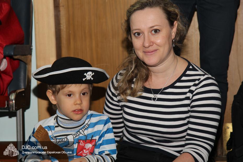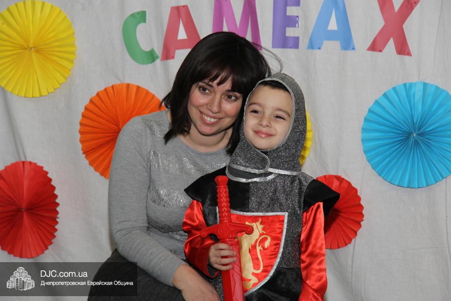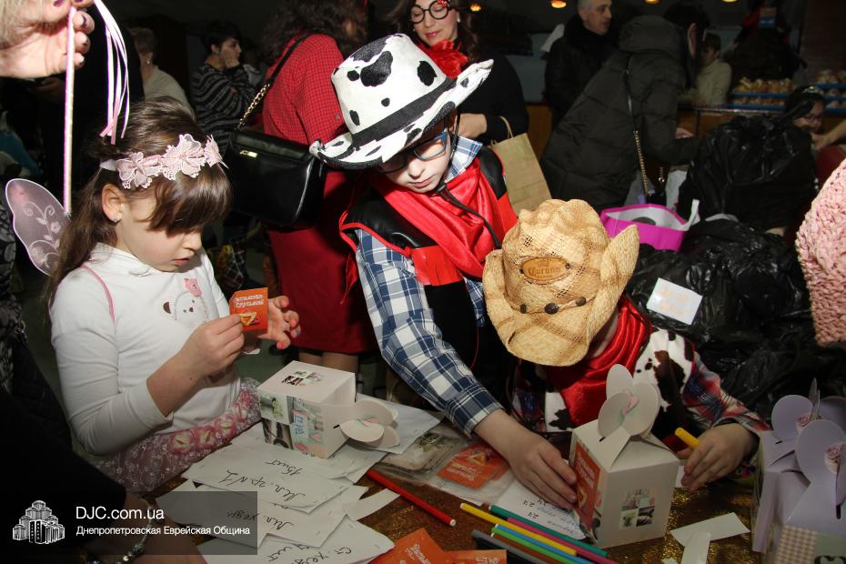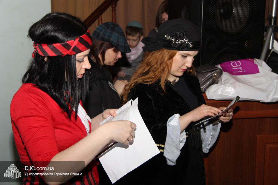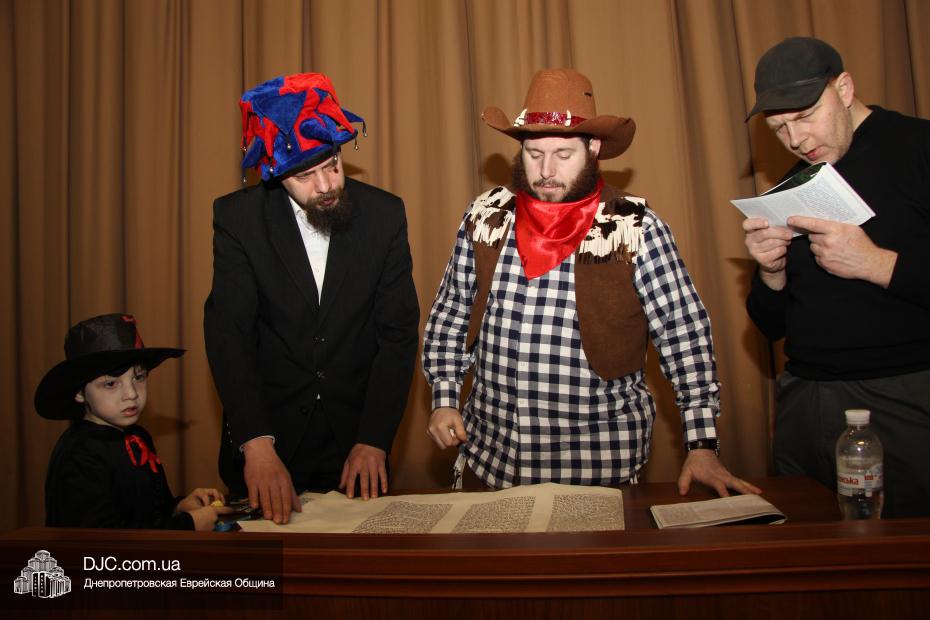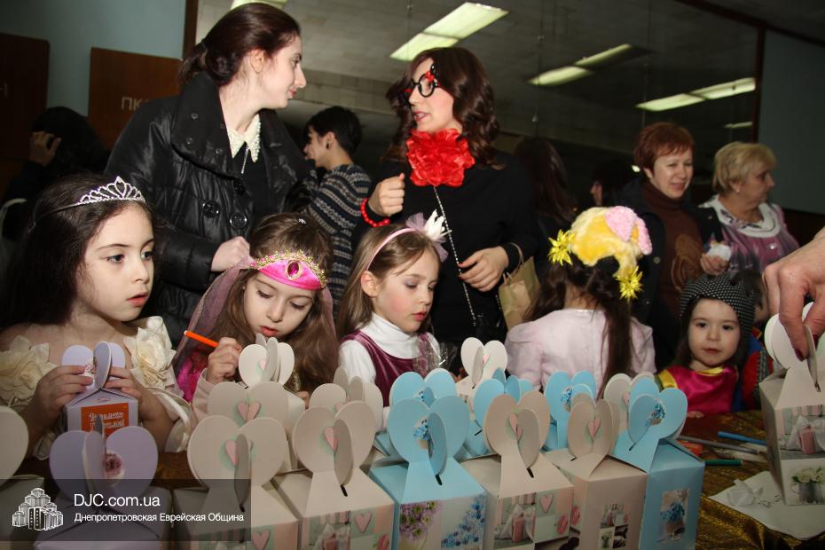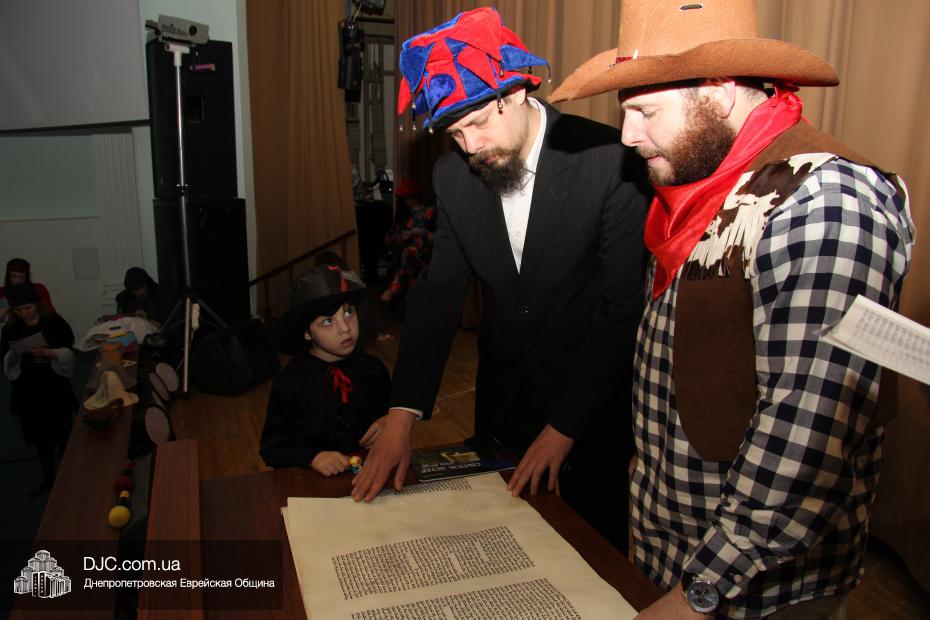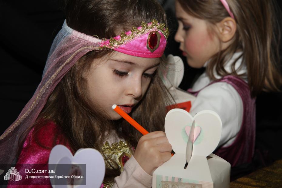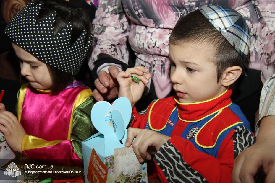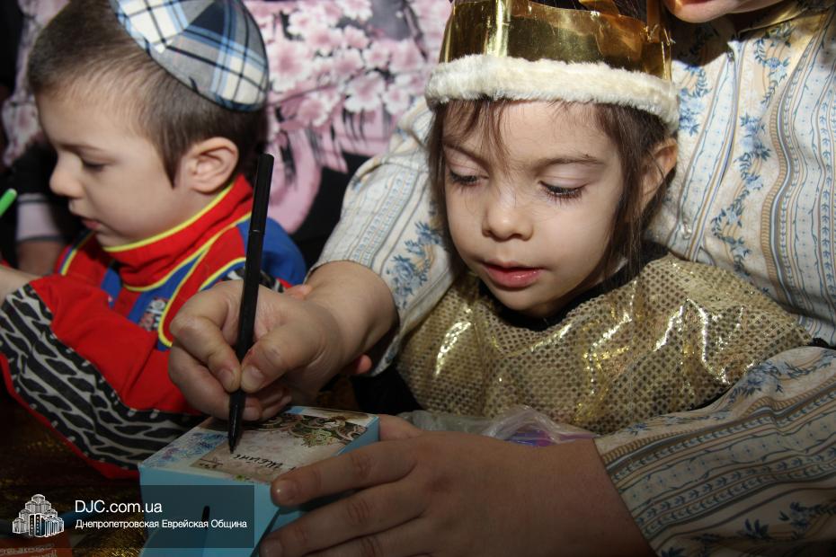 Вначале всех малышей вместе с родителями разделили на группы (а в первой части празднования принимали участие только воспитанники дошкольных учебных заведений нашей общины), и часть гостей отправилась в большой зал слушать свиток Эстер, который читал Менди Гольдшмит, а часть отправилась по станциям. На одной предлагалось пуримское угощение, на второй – можно было сделать подарок своему другу и, в свою очередь, получить подарок от друзей, а еще одна станция приглашала всех сфотографироваться на память об этом празднике. Чуть позже группы поменялись местами – прослушавшие свиток, отправились по станциям, а отстанционившиеся – смогли послушать Свиток.
