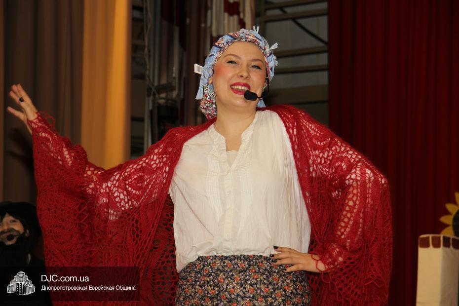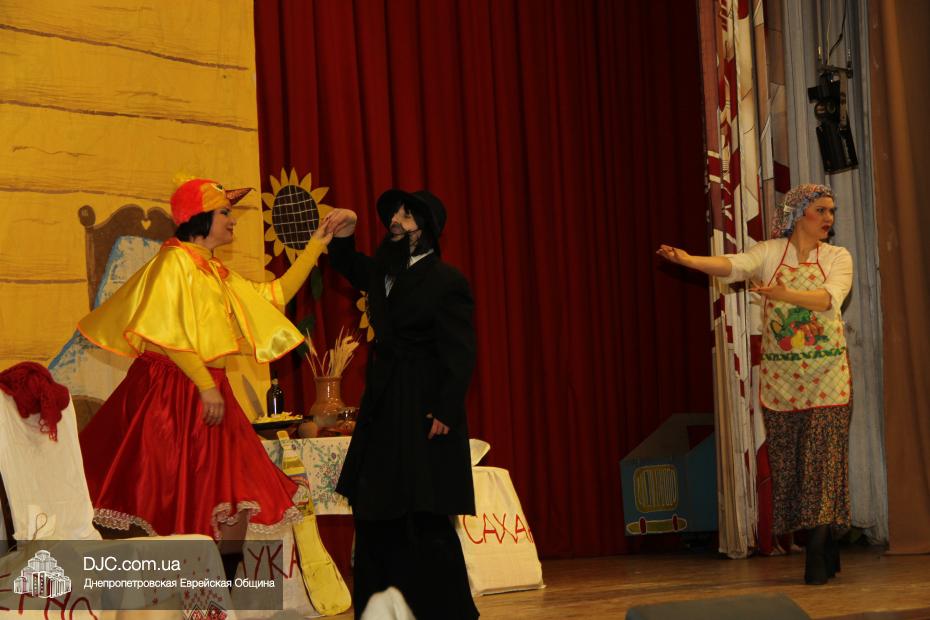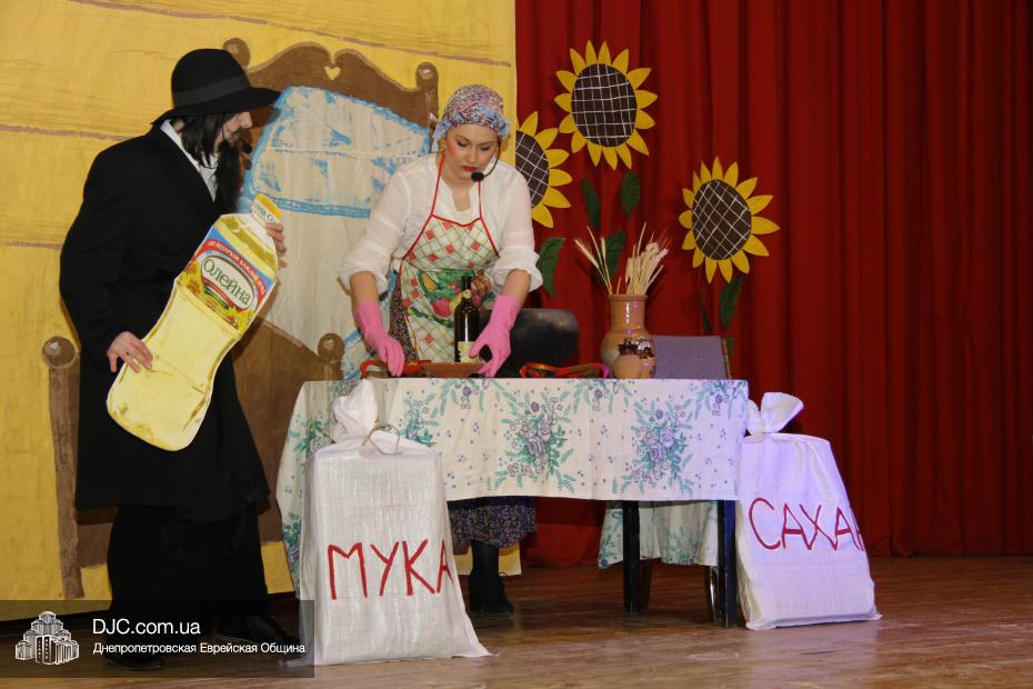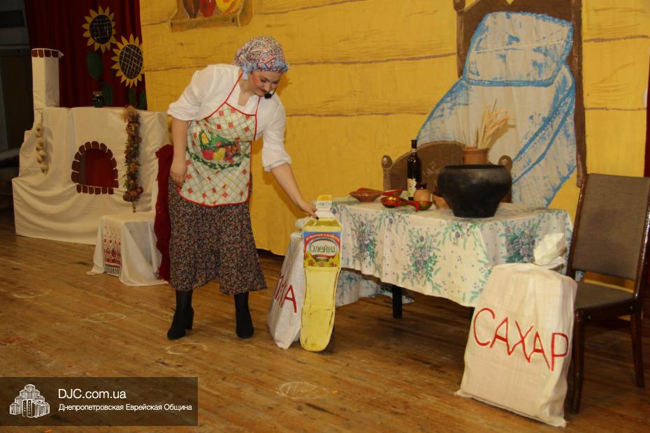 В спектакле рассказывалось о том, как «жили в славном городе Бердичев дед Ицхак и баба Сара», и как деду, как это водится в сказках, захотелось, чтобы баба что-нибудь испекла. В данном случае, гоменташн, ибо, что еще можно испечь к Пуриму? Баба же, по сусекам скрести не захотела и стала требовать от деда ингредиентов, точно соблюдая закладку блюда, предписанную ГОСТом. Так, например, ни машинное, ни тыквенное, ни облепиховое, ни оливковое, ни сливочное масло ей не подошло, а подошло только подсолнечное, а когда оно было ей вручено, кулинару-перфекционистке понадобились куриные яйца, и деду Ицхаку пришлось вести переговоры, с имеющей монополию на производство яиц, курицей, которой не подходило ни золото, ни благовония, ни все блага земные и морские, а токмо и единственно – «зерно перебранное». Намаявшись, дед так устал, что уснул и не заметил, как тесто подошло, а тут время приспело идти в синагогу, а пока дед с бабой в синагоге были, тесто замесилось, раскаталось, положило в себя начинку и испеклось, правда, порезать себя на части тесто не осмелилось, и от того гоменташн получился таким большим, что развалил печь и часть дома. Дед и баба, увидев такое диво, вызвали грузовик, отвезли гигантский коржик в центр города и, не занося его в Книгу Гинесса, порезали его на части и раздали добрым людям в честь Пурима, ну, а те, в свою очередь, построили новую печку и новый дом, и все кончилось хорошо, как всегда бывает в Бердичеве.