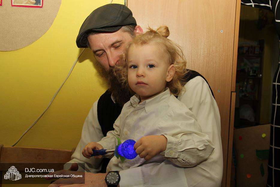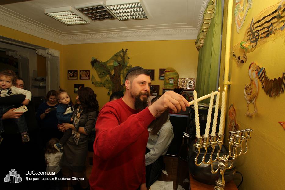 Зажечь Ханукию в ясельках был приглашен один из родителей старшей группы, папа Эсти – Мелех Балабанов, который, прочитав благословения, зажег, как и положено в этот день Хануки, четыре свечи. Затем все дружно – и малыши, и родители, и все герои кукольного спектакля – спели традиционный ханукальный гимн.