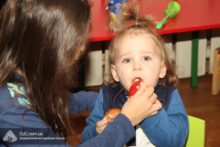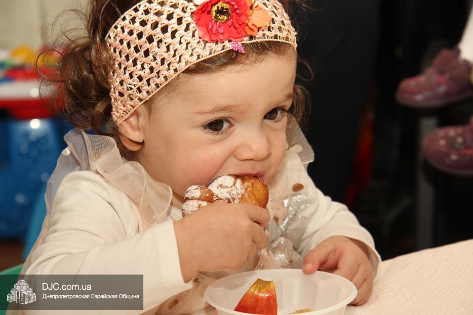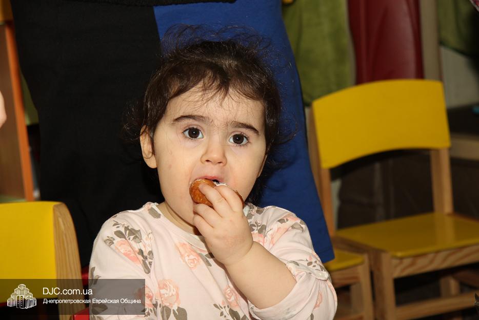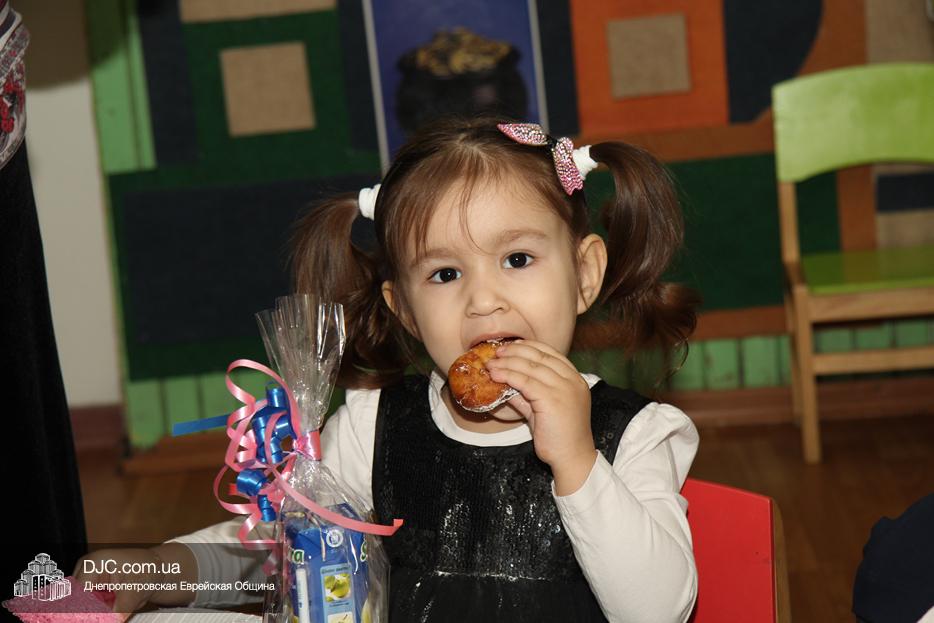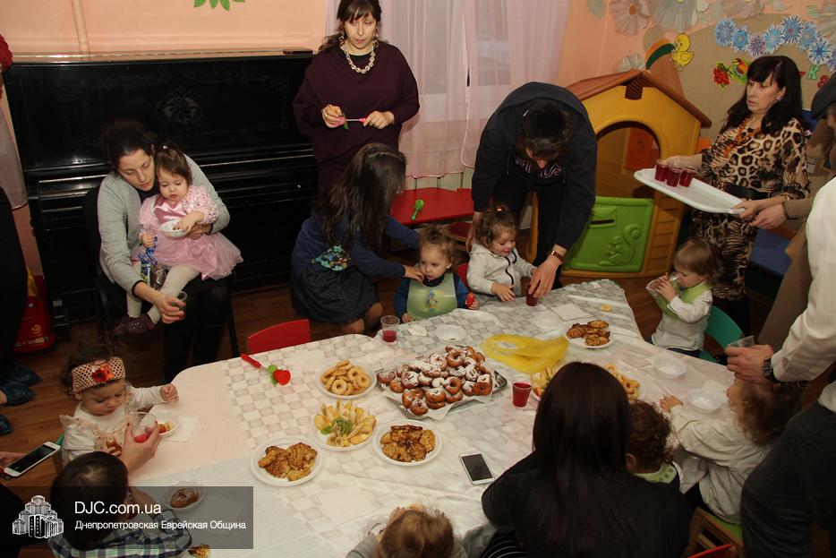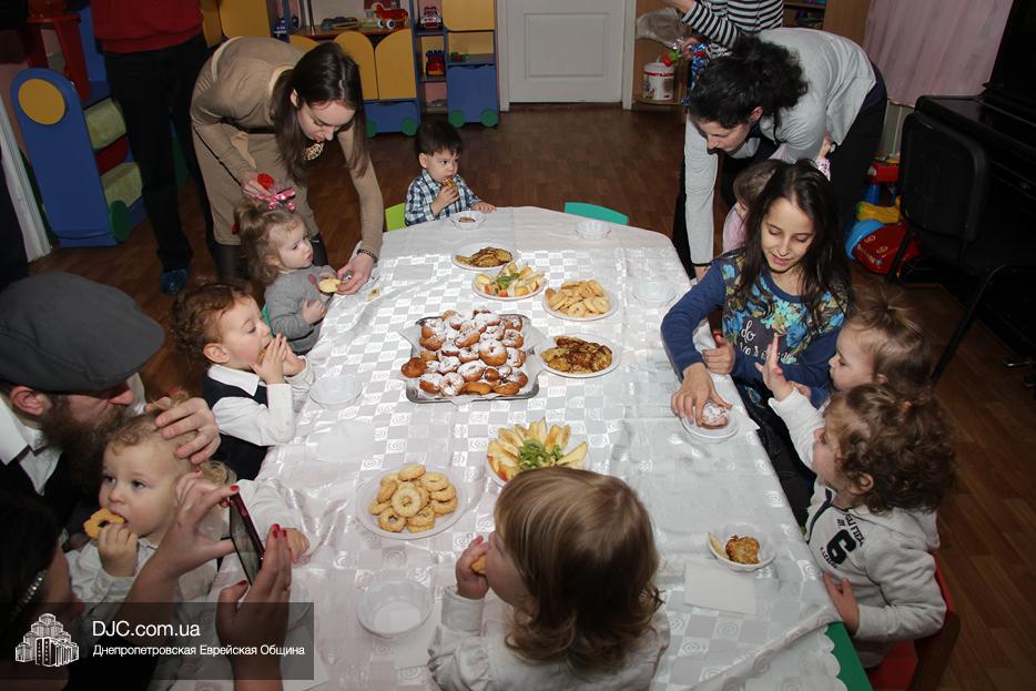 Затем вновь были танцы и раздача вкусных и полезных ханукальных подарков, которыми малышей порадовала «мадам Ханукия». Ну, а завершило утренник вкусное ханукальное угощение для детей и родителей – латкес и суфганийот.