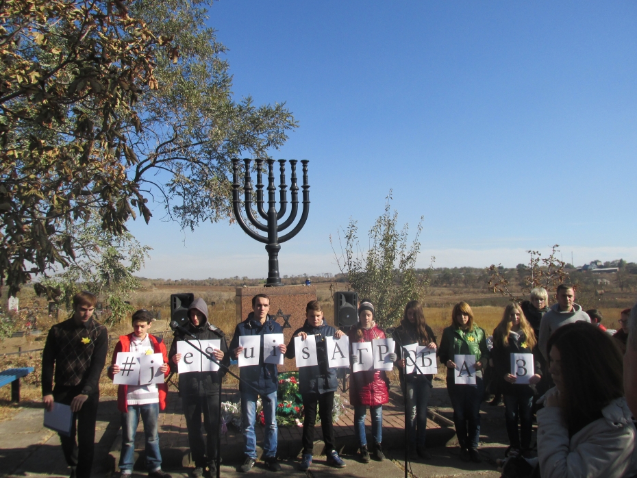 Главный раввин Мариуполя Менахем Мендел Коэн прочел поминальные молитвы, и были зажжены свечи памяти. Затем состоялось выступление учеников вечерней еврейской школы «Ор Авнер», прозвучали стихи мариупольского поэта Игоря Герланца, посвященные памяти жертв Агробазы. Особо следует отметить, что впервые в этом году самое активное участие в мероприятии приняли ребята и девушки, посещающие молодежные программы, не только выступившие, но и одевшие желтые звезды, которые предложили надеть всем, как знак солидарности и скорби. Лозунгом они избрали «#je suis jude», используя памятную формулу солидарности с французским журналом, ставшим жертвой террористической атаки. (Следует отметить, что первые два слова – «#je suis – это по-французски и, продолжая эту фразу третьим словом должно было быть Juif, однако, мариупольчане решили, что будет более понятным иной вариант написания, и что это подчеркнет интернациональность трагедии, ее всеевропейское значение, преодолевающее языковые границы).