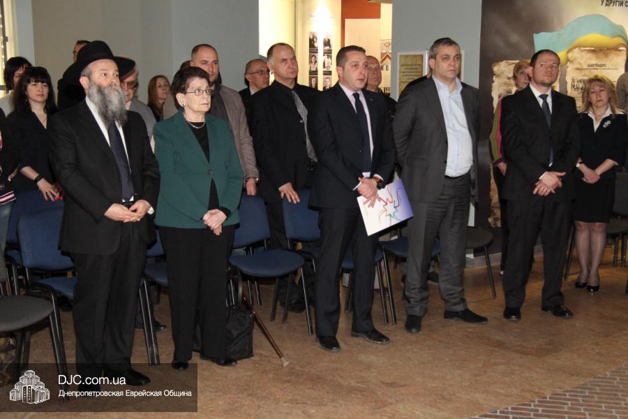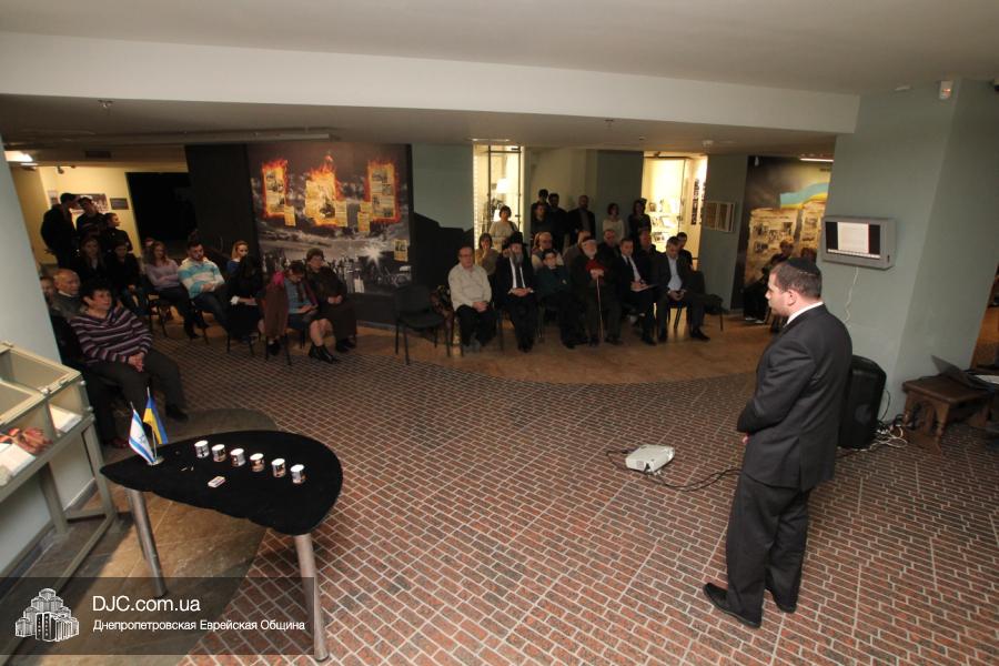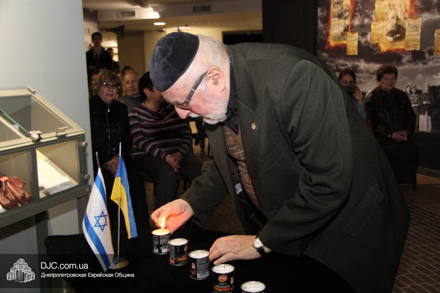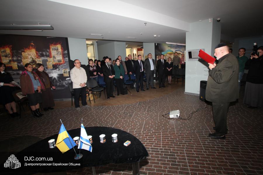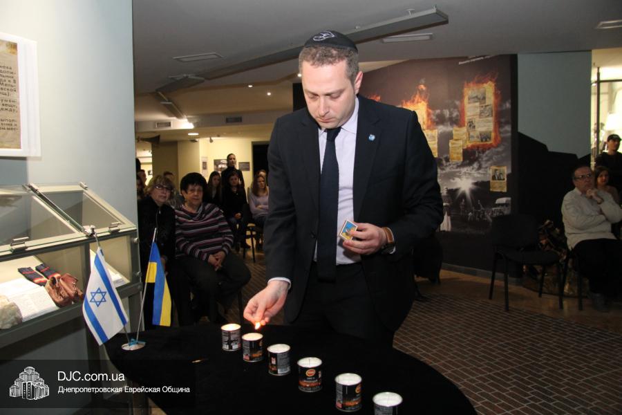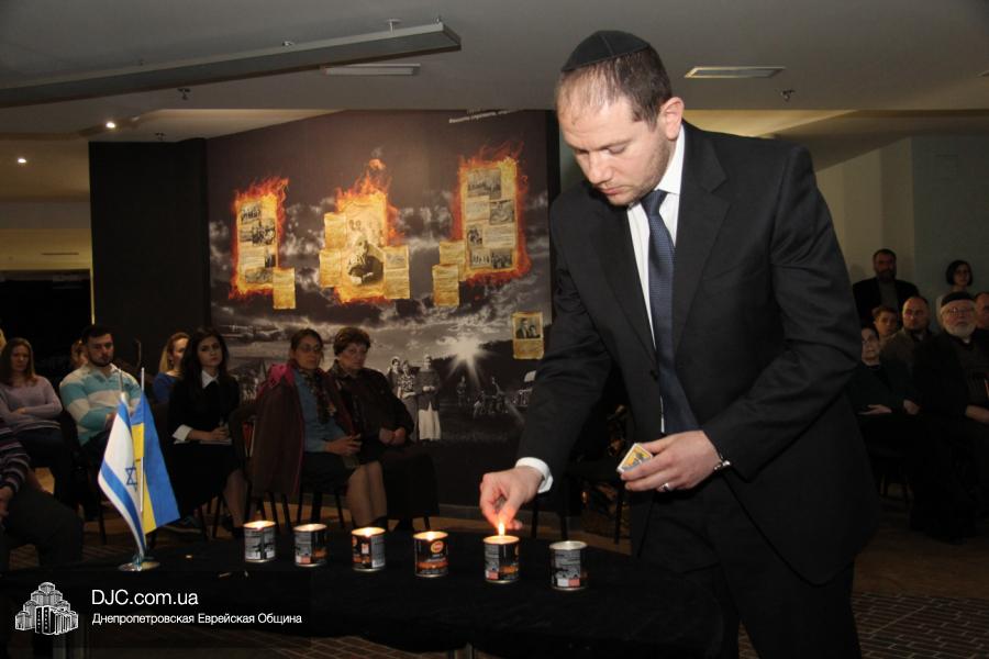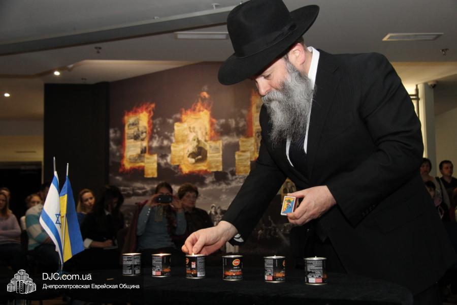 Далее слово было предоставлено советнику губернатора Днепропетровской области господину Борису Трейгерману, председателю правления центра «Джойнт» в восточной Украине Йонатану Лейферу и старшему научному сотруднику УИИХ «Ткума» Дильфузе Глущенко. Каждому из выступавших была предоставлена честь зажечь нер нешама в честь шести миллионов безвинных жертв нацизма.
