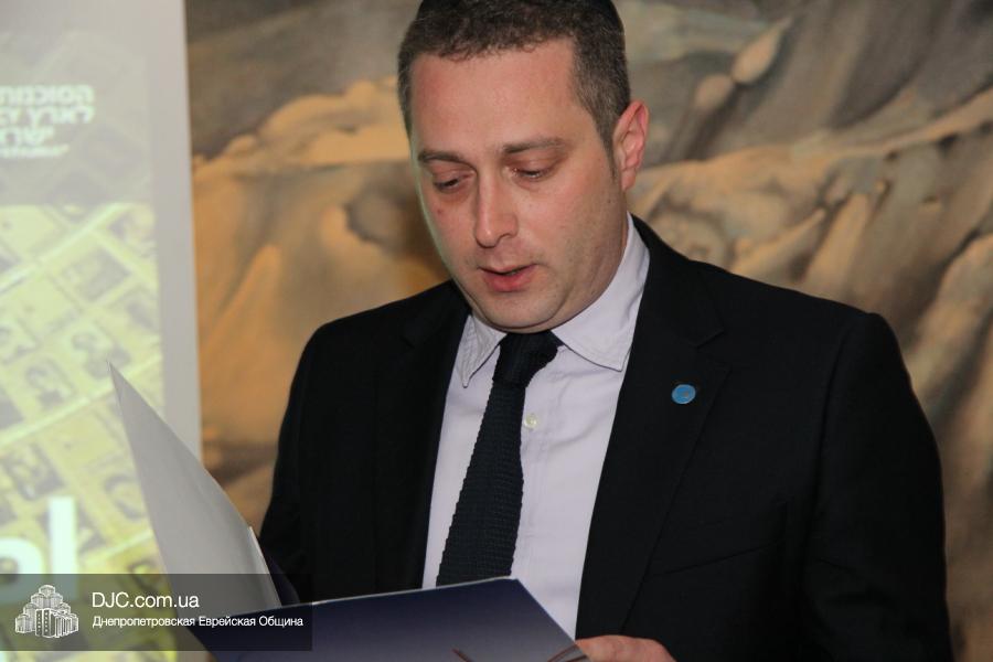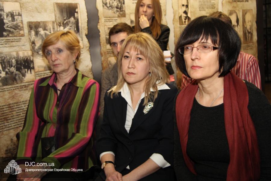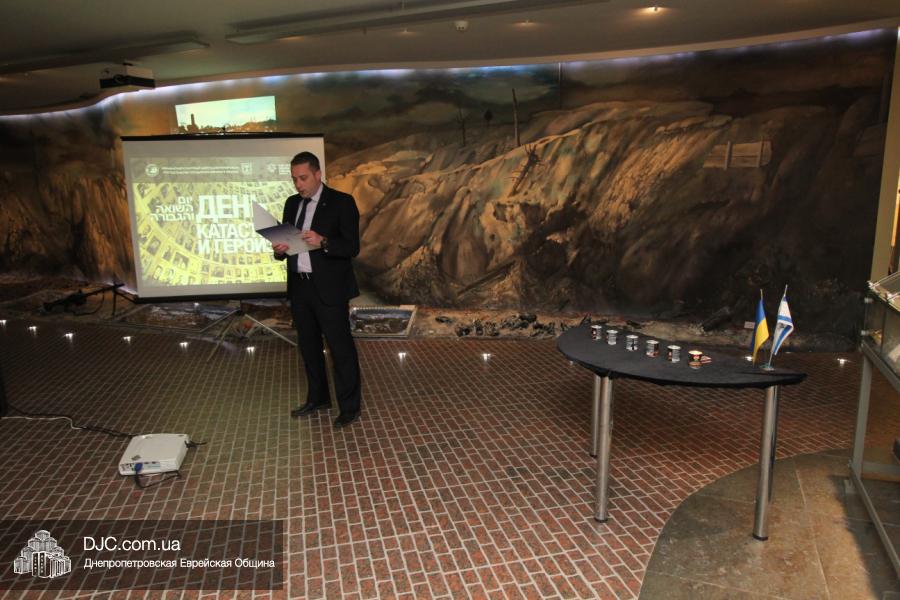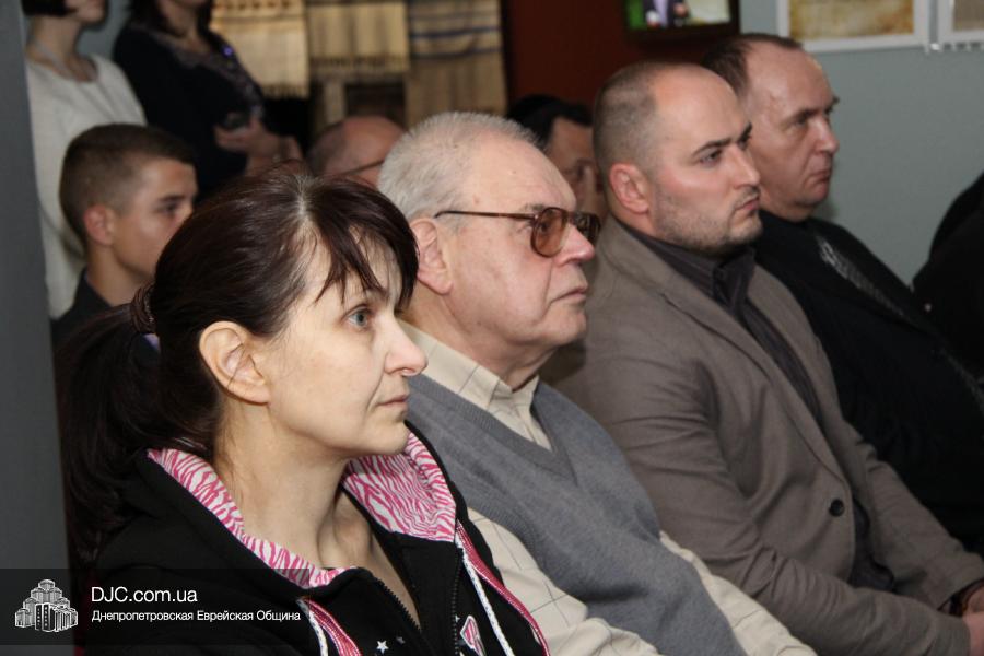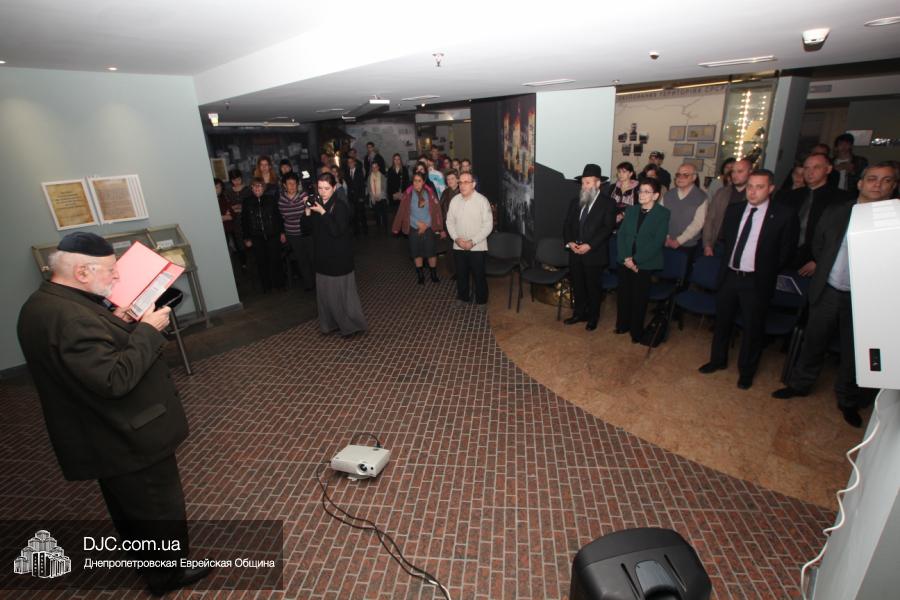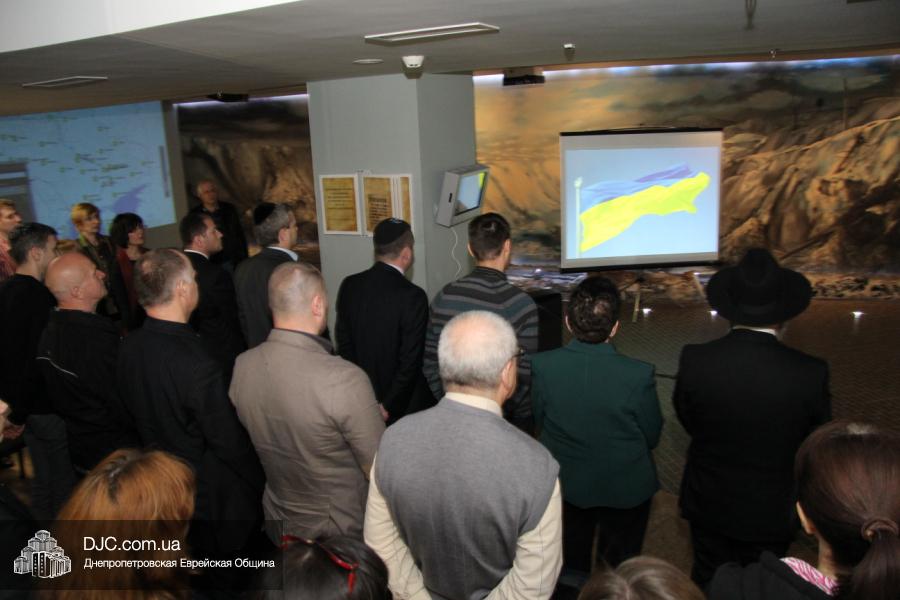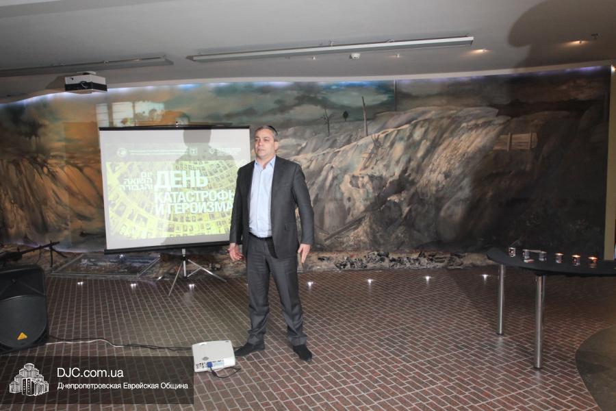 Далее слово было предоставлено советнику губернатора Днепропетровской области господину Борису Трейгерману, председателю правления центра «Джойнт» в восточной Украине Йонатану Лейферу и старшему научному сотруднику УИИХ «Ткума» Дильфузе Глущенко. Каждому из выступавших была предоставлена честь зажечь нер нешама в честь шести миллионов безвинных жертв нацизма.