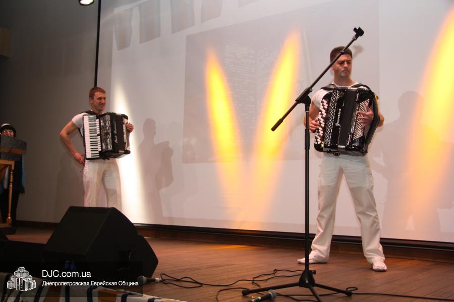 Перечислять все коллективы и отдельных артистов, наверное, нет необходимости – все они выступали довольно ровно, примерно на одном уровне, и юные звездочки тетра «Золотой ключик», и финалист телевизионного шоу «X-фактор» Владимир Куликов, и вокальная студия ЕОЦ «THE BEST». Но особо мне хотелось бы выделить два коллектива: дуэт аккордеонистов «Монте Карло», блестяще исполнивших попурри из самых известных еврейских мелодий, и вокальный ансамбль с музыкально-бухгалтерским названием «Invoice», сразу напомнивший легендарных «Свинглов» («The Swingle Singers»). Они исполнили несколько чудесных композиций (даже дассенновскую «Les Champs-Elysees»), но многих, в том числе и меня, до слез растрогал их подарок еврейскому народу – песня Бобби Макферрина «Don"t Worry, Be Happy», которую музыканты открыто посвятили не только Израилю, но и всему еврейскому народу. Спасибо, «Invoice»!