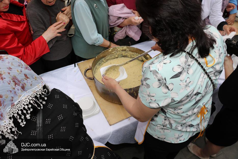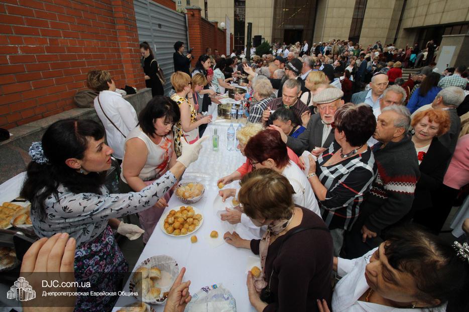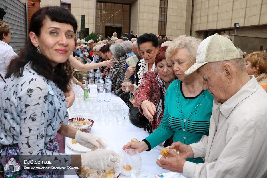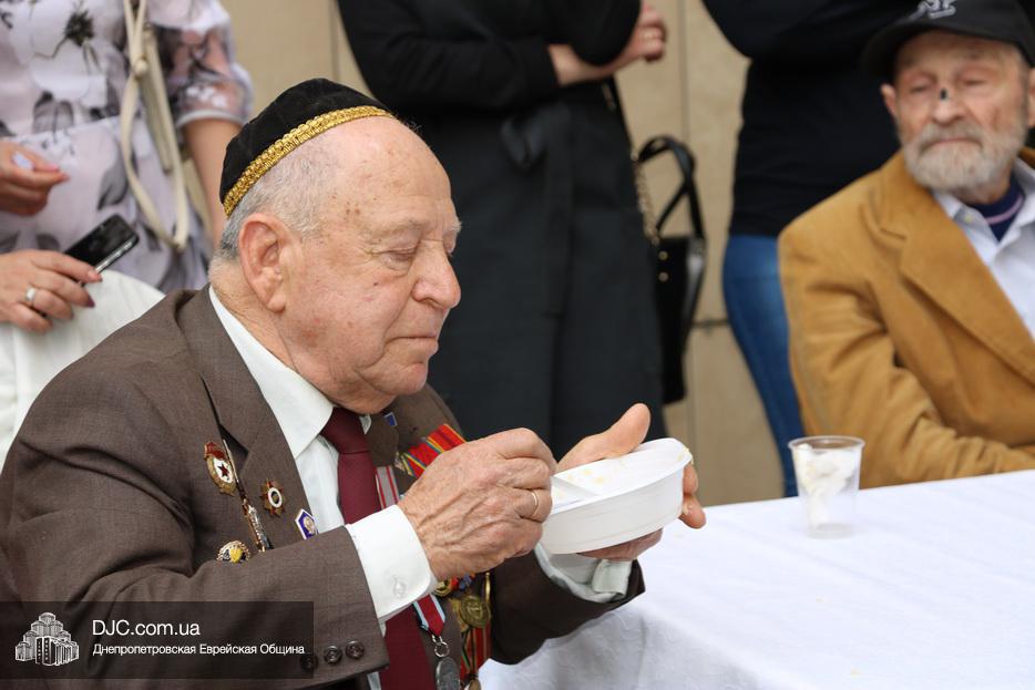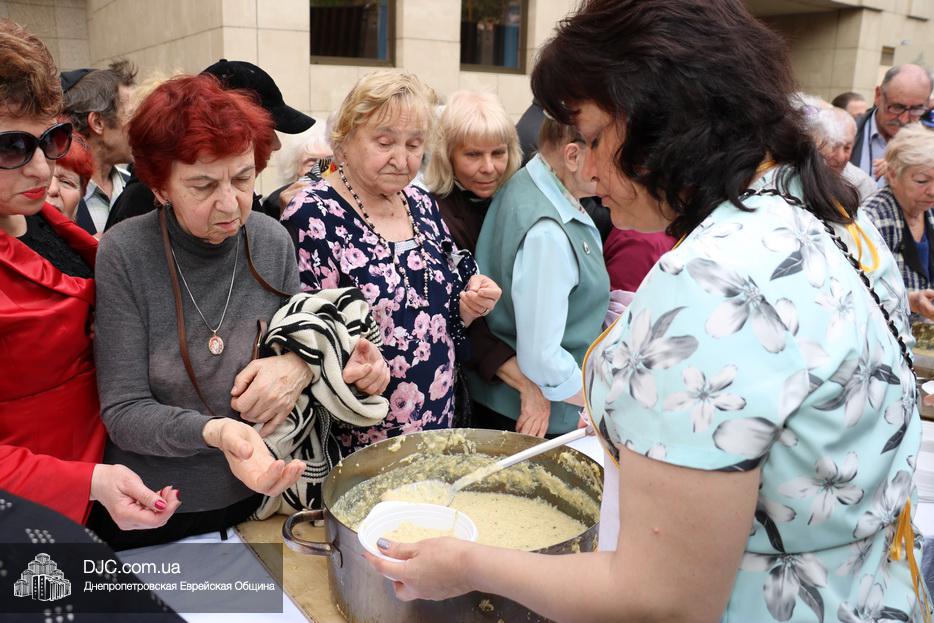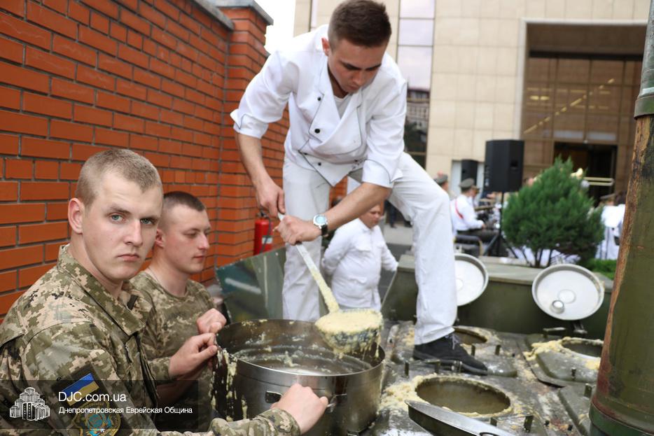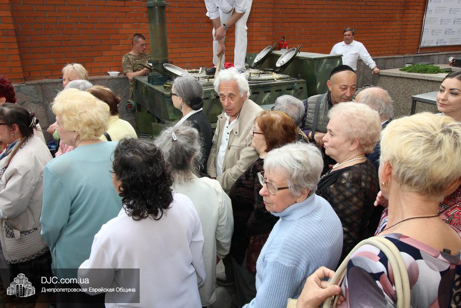 Как всегда, сотни людей пришли, чтобы по традиции выпить фронтовые «стограмм» и отведать настоящей солдатской каши, в которой, по другой традиции, установленной Хеседом, и благодаря помощи со стороны еврейской общины Днепра, в качестве мяса используется только кошерная курятина. Конечно, кроме каши, были и другие угощения от «Хеседа Менахем».