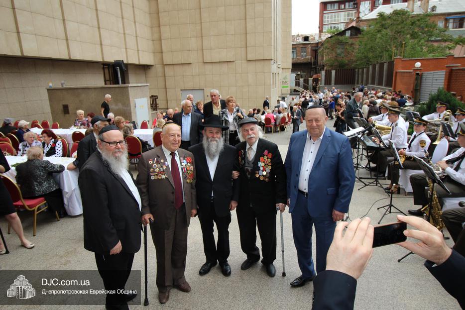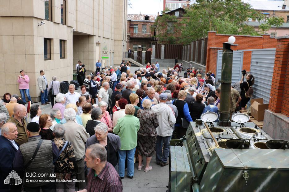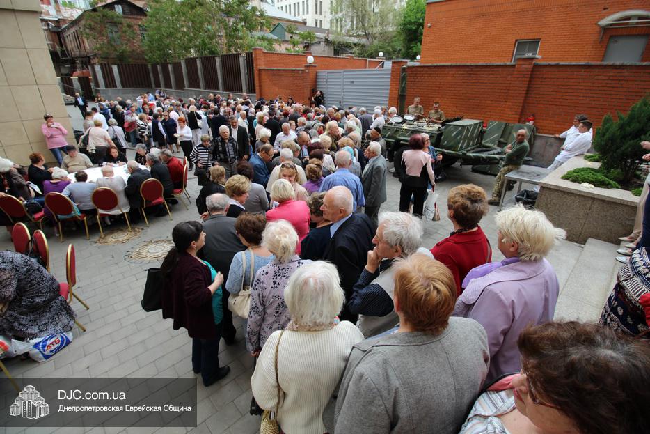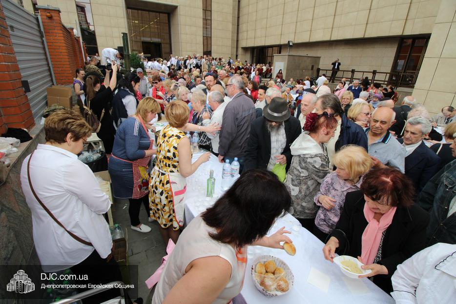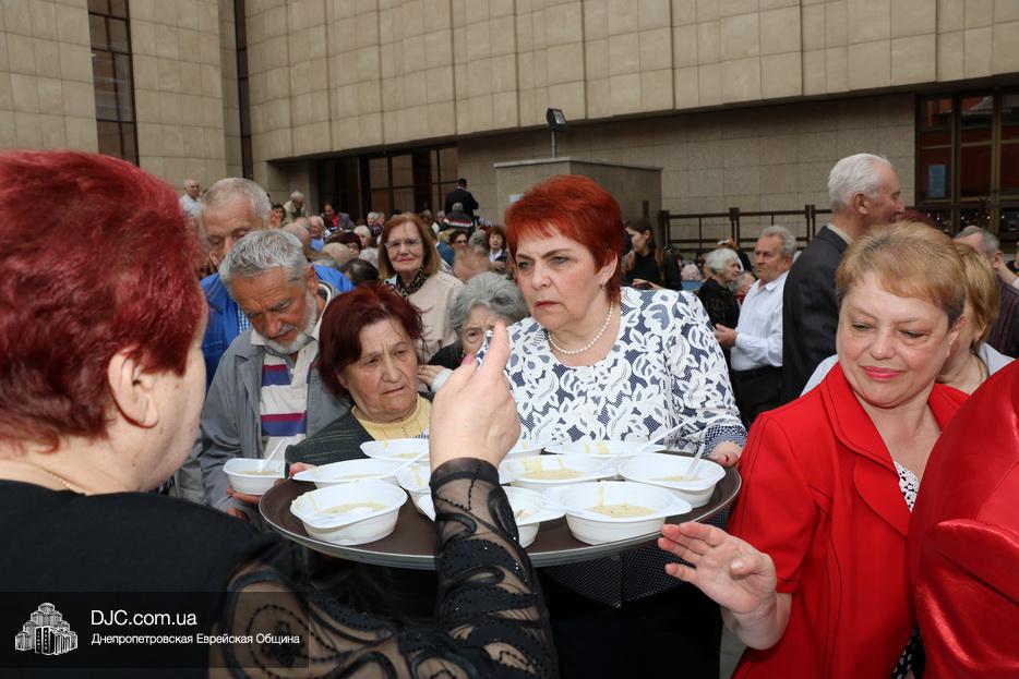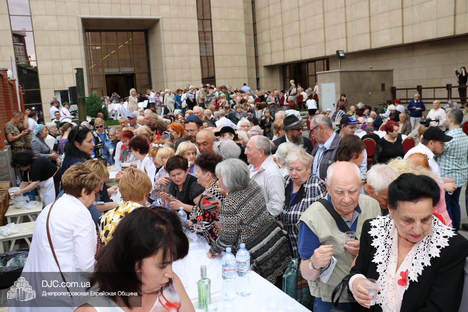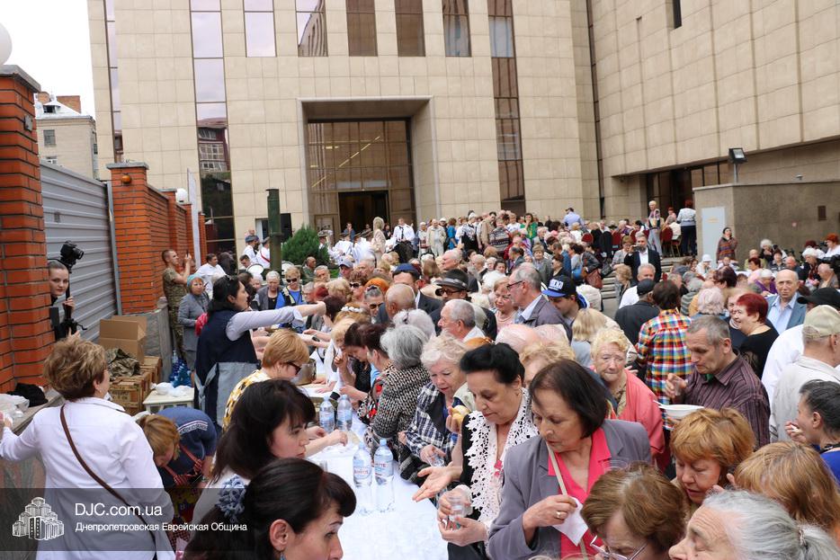 Как всегда, сотни людей пришли, чтобы по традиции выпить фронтовые «стограмм» и отведать настоящей солдатской каши, в которой, по другой традиции, установленной Хеседом, и благодаря помощи со стороны еврейской общины Днепра, в качестве мяса используется только кошерная курятина. Конечно, кроме каши, были и другие угощения от «Хеседа Менахем».