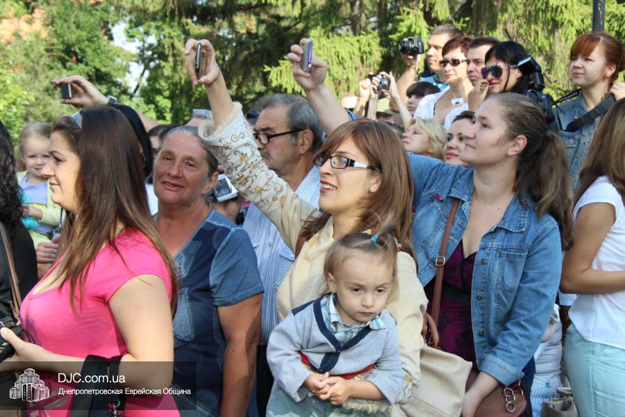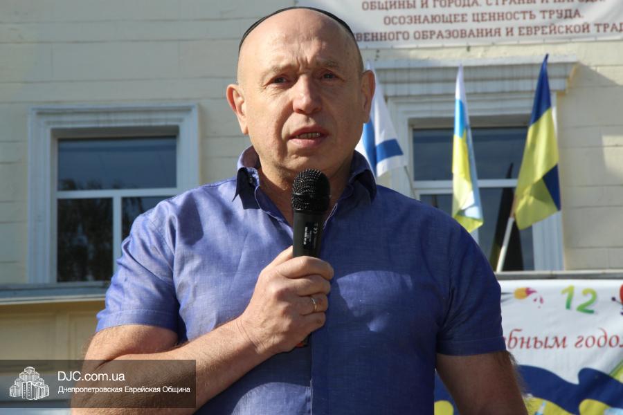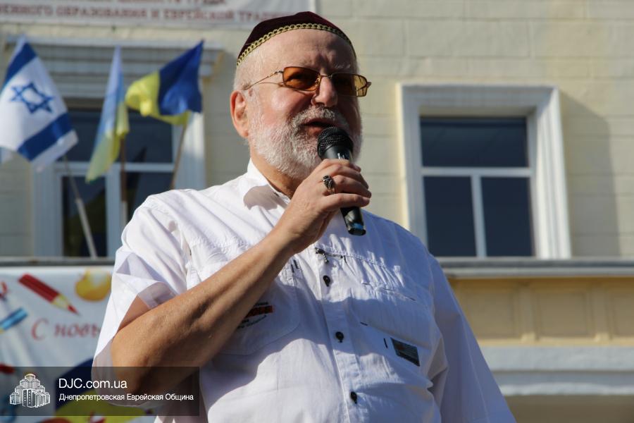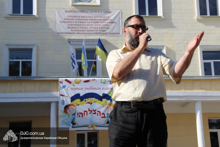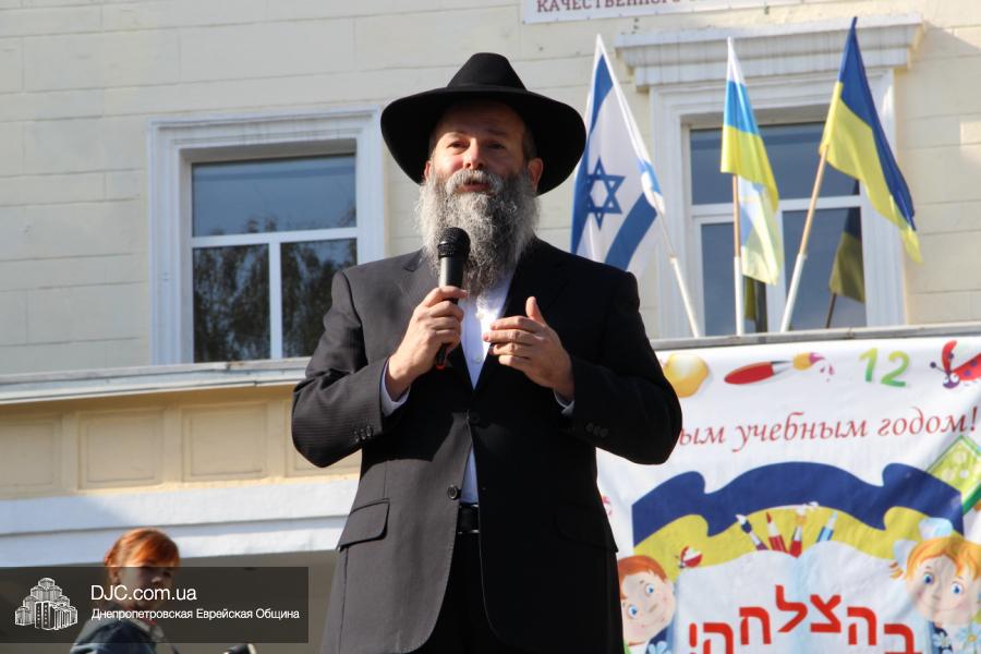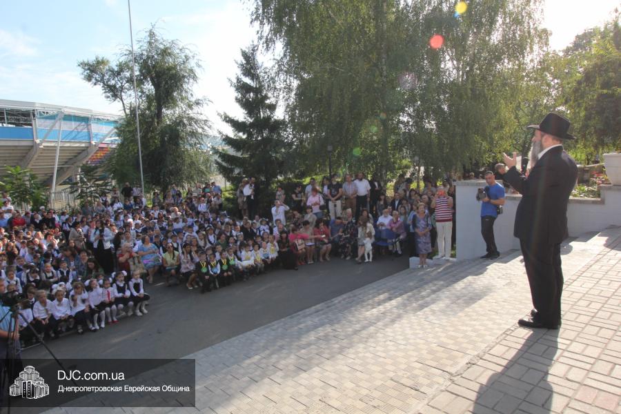 Далее на сцену был приглашен Главный раввин Днепропетровска и региона Шмуэль Каминецкий, который поздравил школьников и их семьи с Днем Знаний. Он отметил, что сегодня очень важно помнить о том, что даже самый маленький свет способен разогнать большую тьму, и что дети, учащиеся в еврейской школе, будут нести полученный в ее стенах свет в свой дом, исполняя заповеди Вс-вышнего и Торы и приобщая к этому своих родителей и близких. Он отметил, что абсолютно уверен, что у Украины есть прекрасное свободное, демократическое, европейское будущее и полоса испытаний будет недолгой.