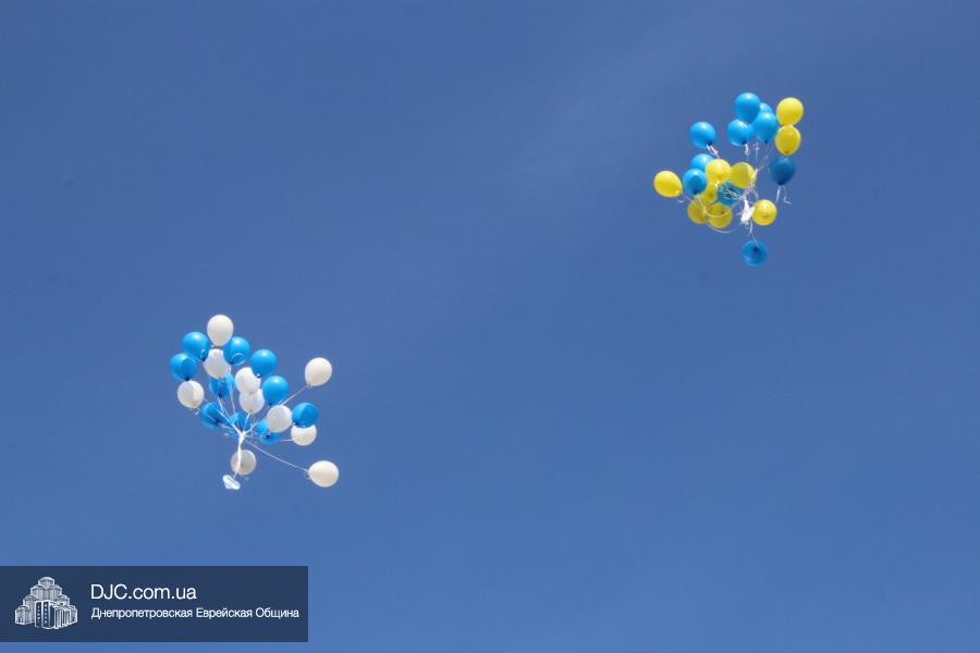 После этого ведущая праздника, завуч по воспитательной работе Татьяна Хавкина, объявила о том, что каждый класс перед началом линейки написал пожелания народу Украины и народу Израиля, для того, чтобы поддержать украинцев и израильтян в это тяжелейшее для двух братских государств и их народов время. Символические сердца с пожеланиями будут украшать стены «альма матер», а на линейке в небо были запущены две связки воздушных шаров — жовто-блакитных и бело-голубых. Они взлетели в сентябрьское небо над Днепром как символ молитвы о мире и защите от сил Тьмы и Зла, нависших над нами.