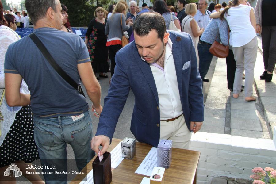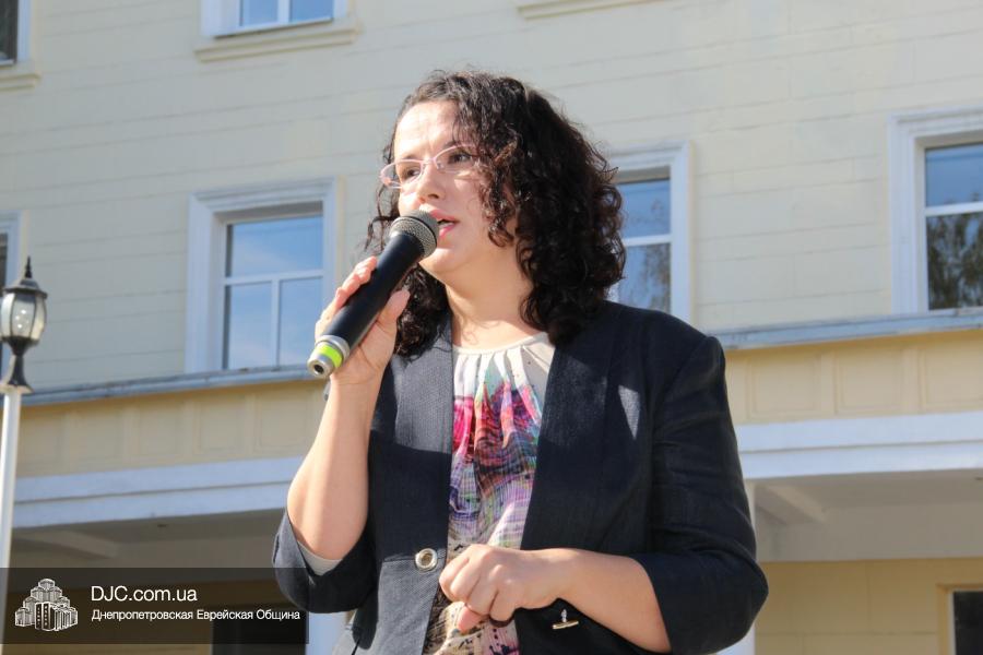 Затем Татьяна Хавкина представила собравшимся почетных гостей церемонии и предоставила слово директору благотворительного фонда «Тиква», члену Попечительского Совета Днепропетровской еврейской общины Виталию Зайднеру, директору филиала «Сохнут-Украина» Натали Набитовски, управляющему делами еврейской религиозной общины Александру Фридкису, координатору «Кегила-проджект» Яну Сидельковскому и члену правления Днепропетровской еврейской общины Олегу Ростовцеву.