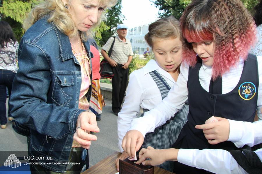 Виталий Зайднер подчеркнул, что еврейская школа присоединилась к движению «Спаси жизнь солдатам и цветам», в рамках которой родителей призывали не тратиться на праздничные букеты цветов для учителей и пожертвовать сэкономленные средства на помощь украинским бойцам. Он отметил, что собранные деньги будут направлены для лечения раненых в областную больницу имени Мечникова, и поблагодарил тех родителей и детей, которые не только отказались от покупки цветов, но и других, более дорогостоящих вещей, и готовы пожертвовать эти деньги на благое дело. Александр Фридкис, в свою очередь, призвал всех, и учеников и их родителей, не забывать, что днепропетровская еврейская школа была создана и успешно функционирует благодаря поистине великим людям – пионерам еврейского возрождения в Днепропетровске Аркадию Леонидовичу Шмисту, Григорию Натановичу Королю и Марии Годеевне Борисонник.