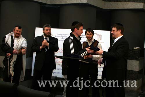 Сегодня в Центральной синагоге Днепропетровска "Золотая Роза" состоялось торжественное вручение тфилинов десяти студентам Национальной Бизнес-школы. Эти студенты выразили желание приобрести особо дорогие тфилины, однако их материальное положение не позволяло им это сделать. Что бы они могли исполнять заповедь, Национальный Сойферский центр при финансовой поддержке Александра Городецкого разработал особую льготную программу приобретение тфилин для студентов Бизнес-школы.