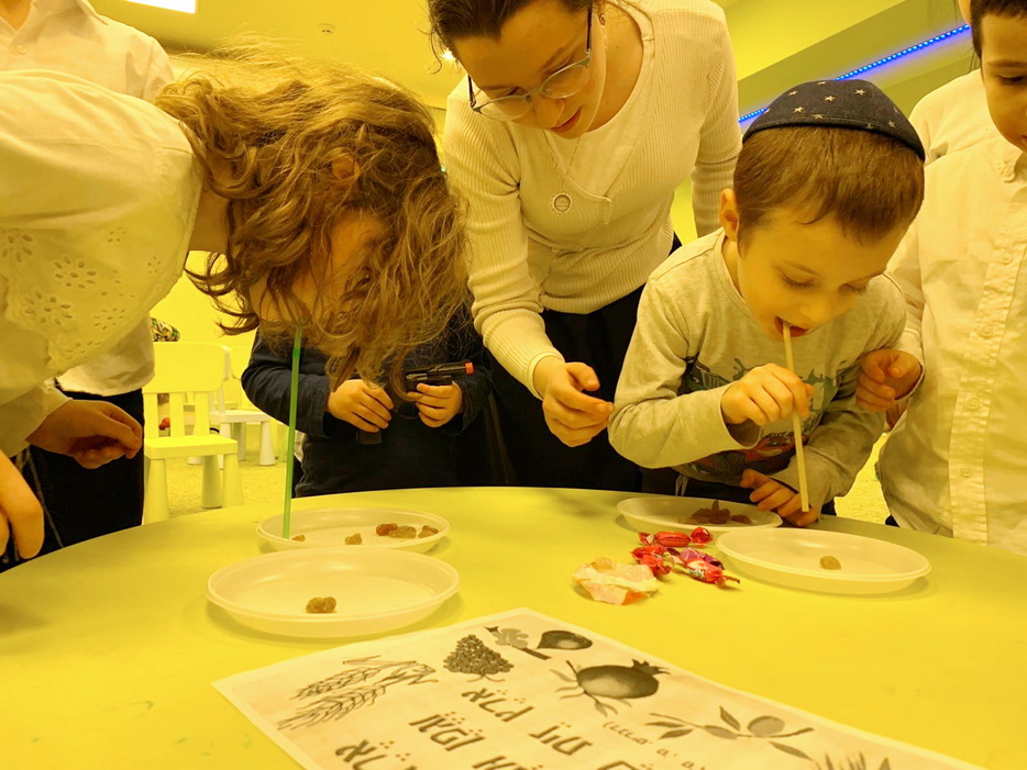 Детский праздник в честь Ту Би Шват начался традиционно – дети прочитали псуким и дали пожертвование в цдоку. Затем они прослушали рассказ о «Семи плодах, которыми славится Эрец Исраэль» и посмотрели кукольный спектакль о том, как плод граната из земли Израиля очень помог одному еврею.
