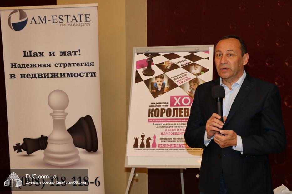Игорь Романов, организатор турнира, выступая перед его открытием выразил глубокую благодарность члену Попечительского совета еврейской общины Днепра, руководителю городской шахматной федерации господину Алексею Маркову, а также сказал немало теплых слов о компании «AM Estate», ставшей партнером в этом проекте. Главный судья турнира международный гроссмейстер Геннадий Гутман разъяснил правила и условия проведения трех параллельных турниров – для детей, имеющих 1-2 разряд по шахматам; для детей, имеющих 3-4 разряд и для безразрядников. Затем была проведена рассадка участников и судейская коллегия объявила старт первого тура.
