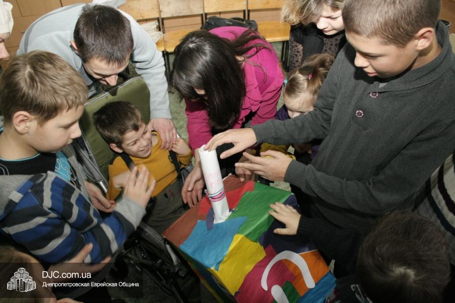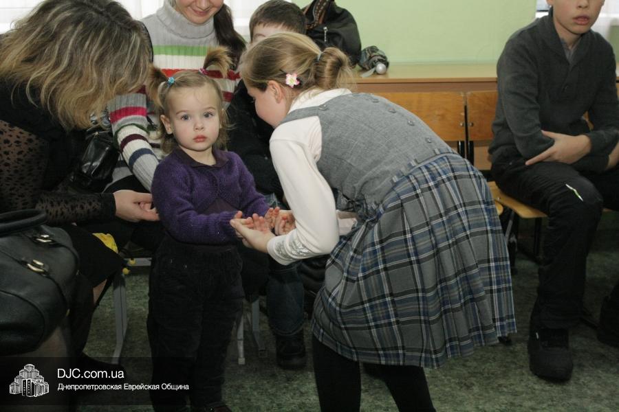 Главной темой встречи стала Ханука и ее атрибуты. Вначале детям рассказали немного о самом празднике, а затем ученики исполнили ханукальную песню. Анна Каплунская в игровой форме провела знакомство, сняв напряжение и настороженность первых минут общения. Вначале детям бросали мягкую игрушку и, поймав ее, надо было рассказать о себе, а потом дети сами пошли знакомиться с новыми друзьями, как вербально, так и тактильно.