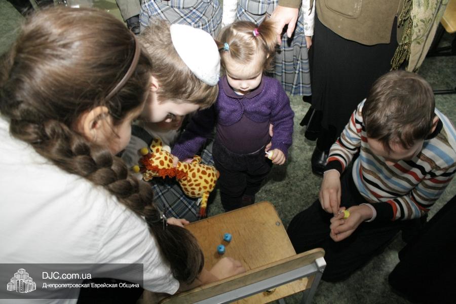 Затем все дети парами «ученик школы — воспитанник ОРЦ» встали в хоровод, центром которого был большой дрейдл, и каждому удалось прикоснуться к нему, как к объединяющему всех символу праздника. После хоровода все получили возможность поиграть в обычные маленькие волчки, «закрутив» их на стуле, что является не только веселым развлечением, но и весьма полезным упражнением, направленным на развитие мелкой моторики рук.