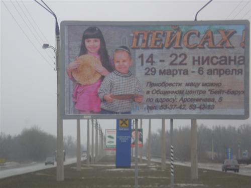 Улицы и магистрали Днепродзержинска украсились бигбордами, информирующими население города о приближении Песаха и о необходимости приобрести к празднику достаточное количество мацы.