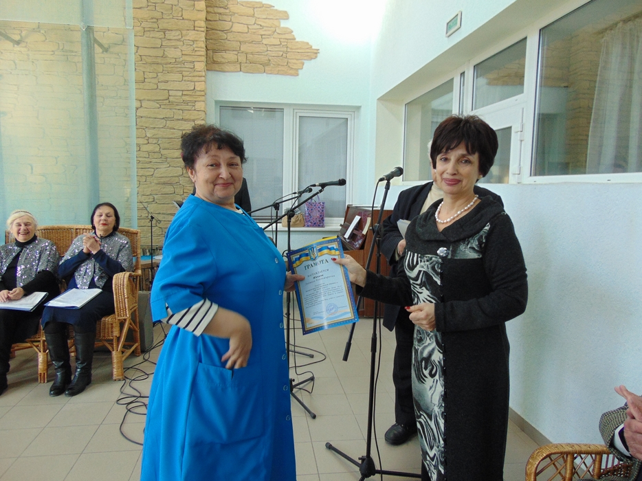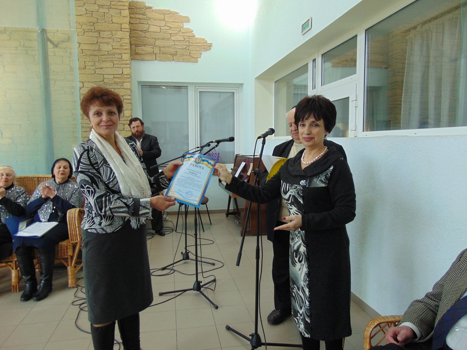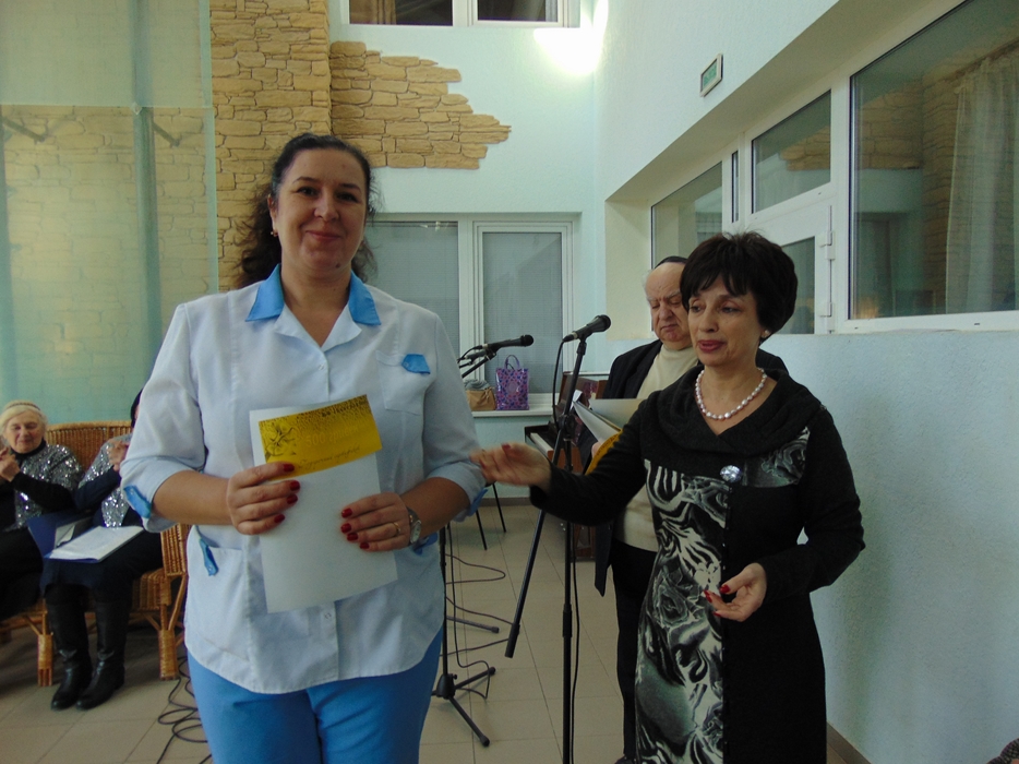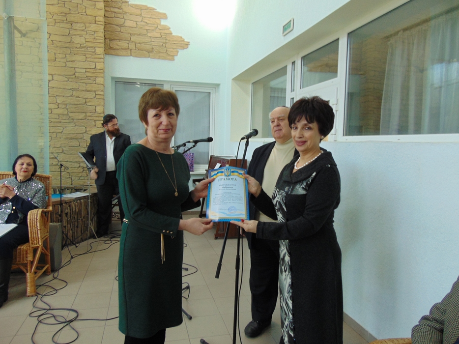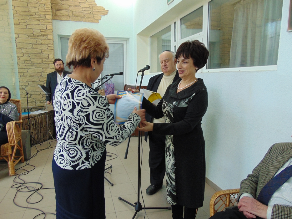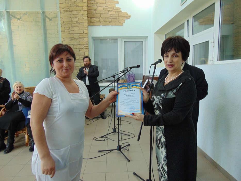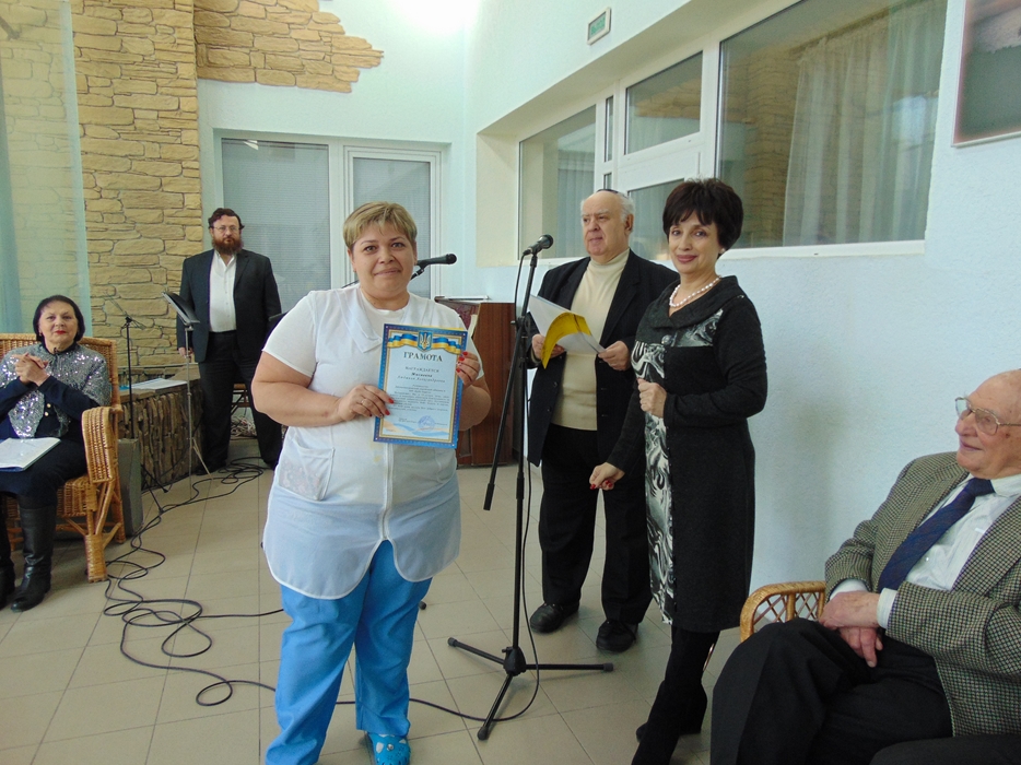 От имени всех друзей Дома, жильцов и сотрудников тепло поздравил председатель совета евреев-ветеранов Соломон Флакс и замечательный коллектив Хеседа «Поющие волонтеры». Затем состоялось награждение тех, кто дольше всех проработал в Доме, стал его душой и хранителем традиций. Особой награды были удостоены трое работников, которые пришли в «Бейт Барух» еще до его официального открытия, и работают в нем свыше 15 лет. Это старшая медсестра Виктория Ляшенко, медсестра Любовь Курасова и лаундри-менеджер Людмила Танина. Были награждены также и семь человек, которые проработали в «Бейт Барух» свыше 10 лет.