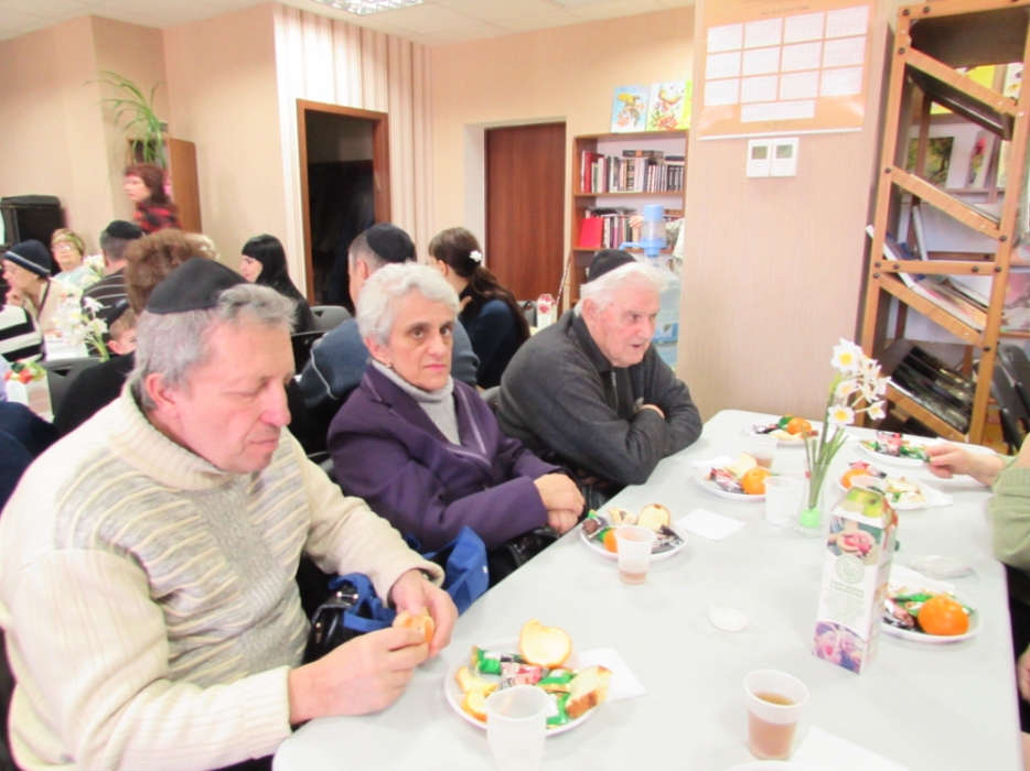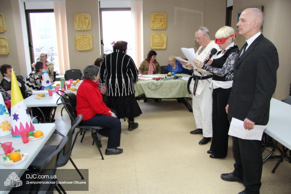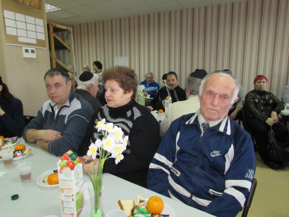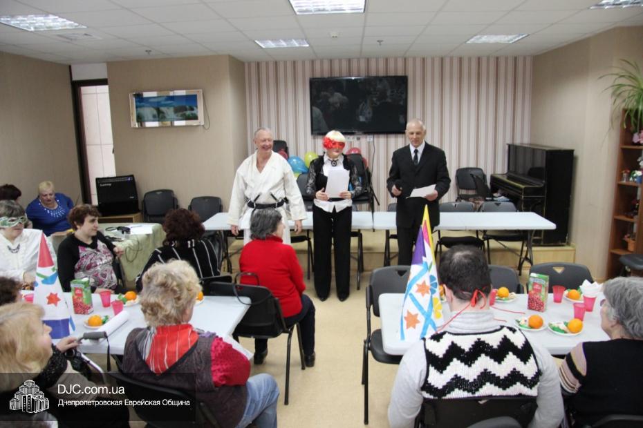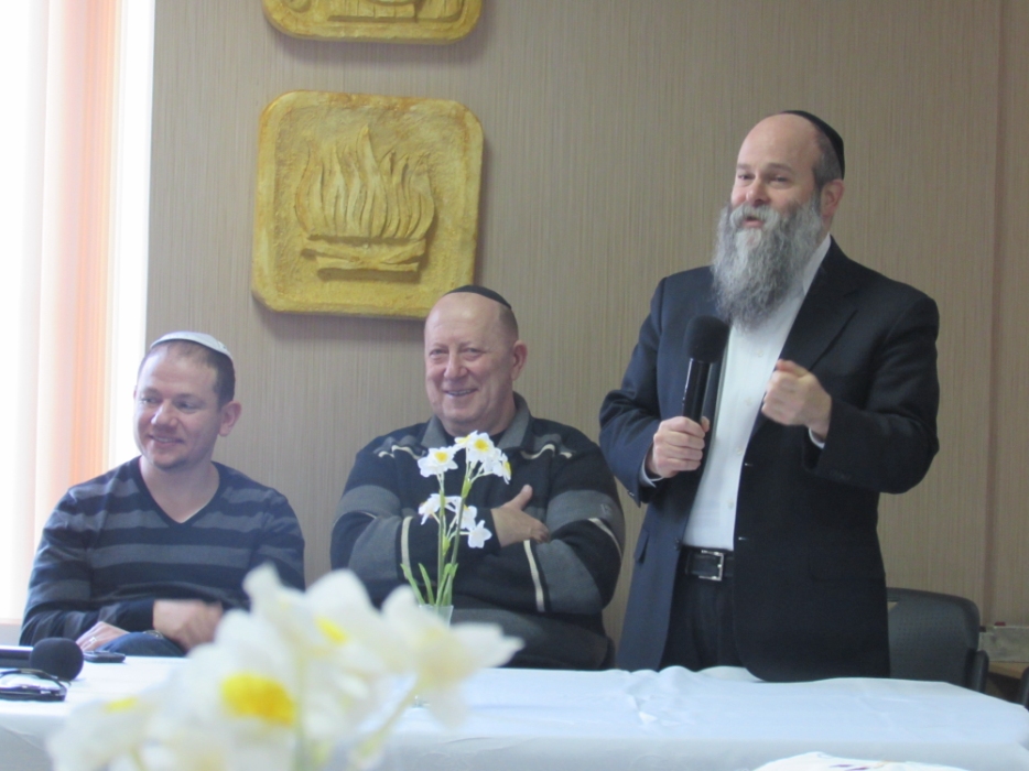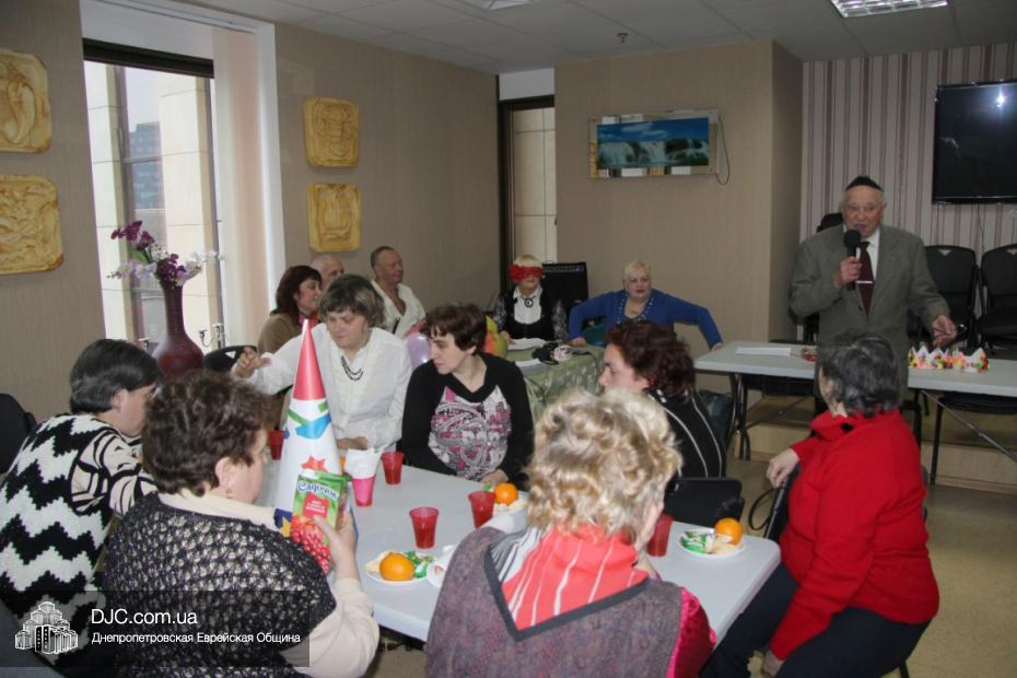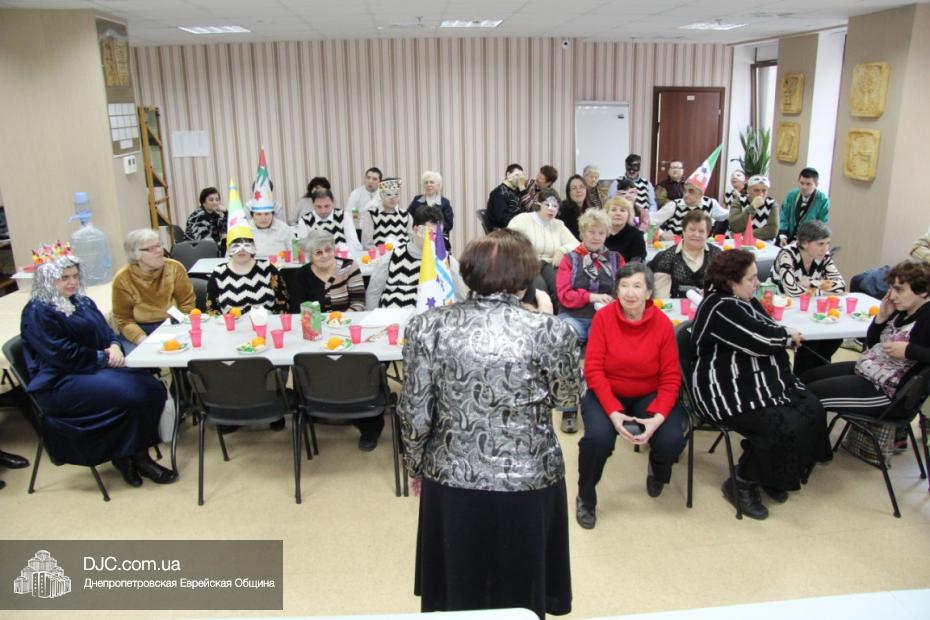 Вначале в клубе «Фрейлахс» была организованна пуримская трапеза и концертная программа для беженцев из восточных областей Украины, подопечных Хеседов Донецка и Луганска, которые, благодаря «Джоинту» и Еврейской общине, смогли обрести теплый и безопасный временный дом в нашей области. Поприветствовать этих людей, переживших ужасы вооруженного конфликта, бесчинства боевиков и террористов, пришли Главный раввин Днепропетровска и региона Шмуэль Каминецкий и председатель правления «Джоинт» в Восточной Украине Йонатан Лейфер. Они, вместе с директором «Хеседа-Менахем» Анатолием Плескачевским, пожелали этим мужественным людям, чтобы все их страдания и тревоги остались в прошлом, чтобы они испытали большую радость от пуримских чудес, чтобы восстановилась в их городах нормальная жизнь и они смогли вновь активно участвовать в возрождении еврейской жизни своих общин.